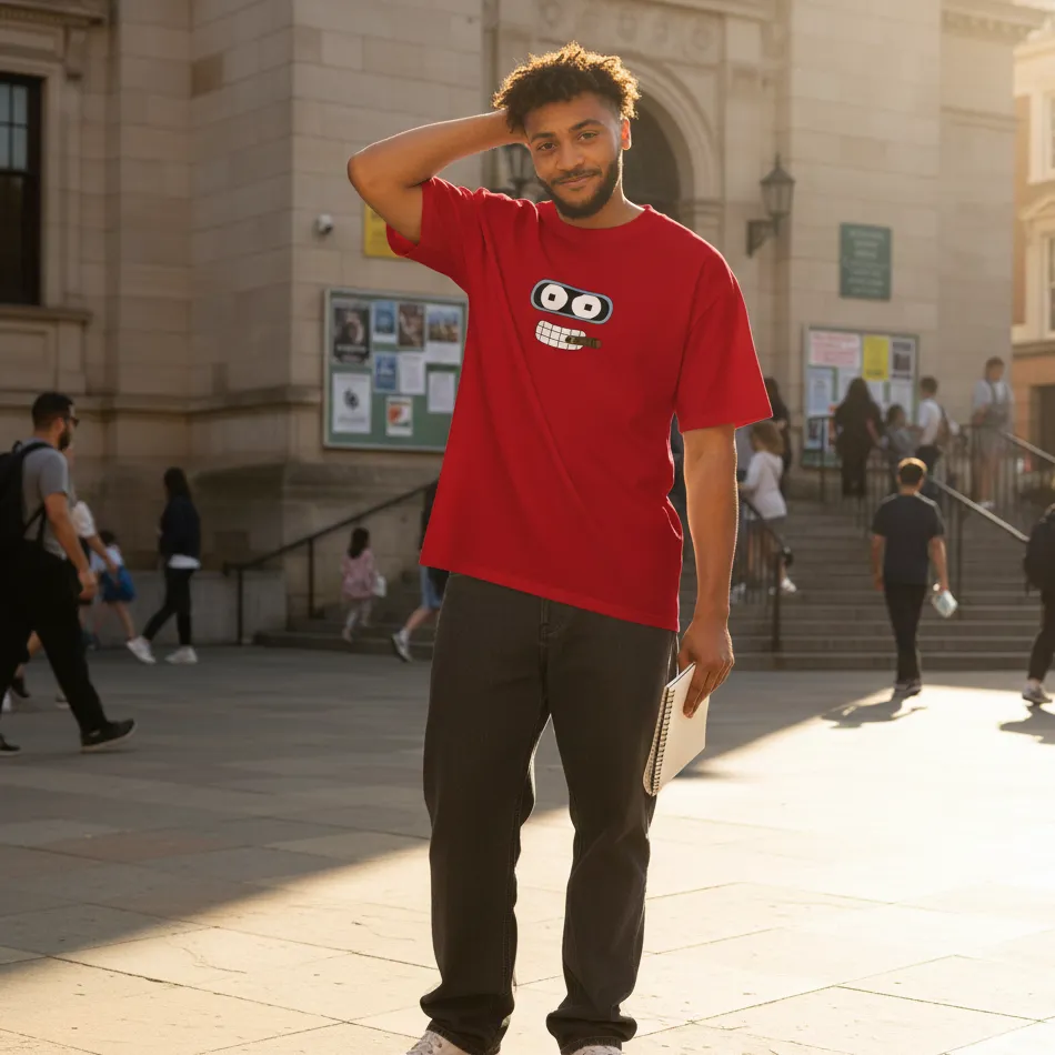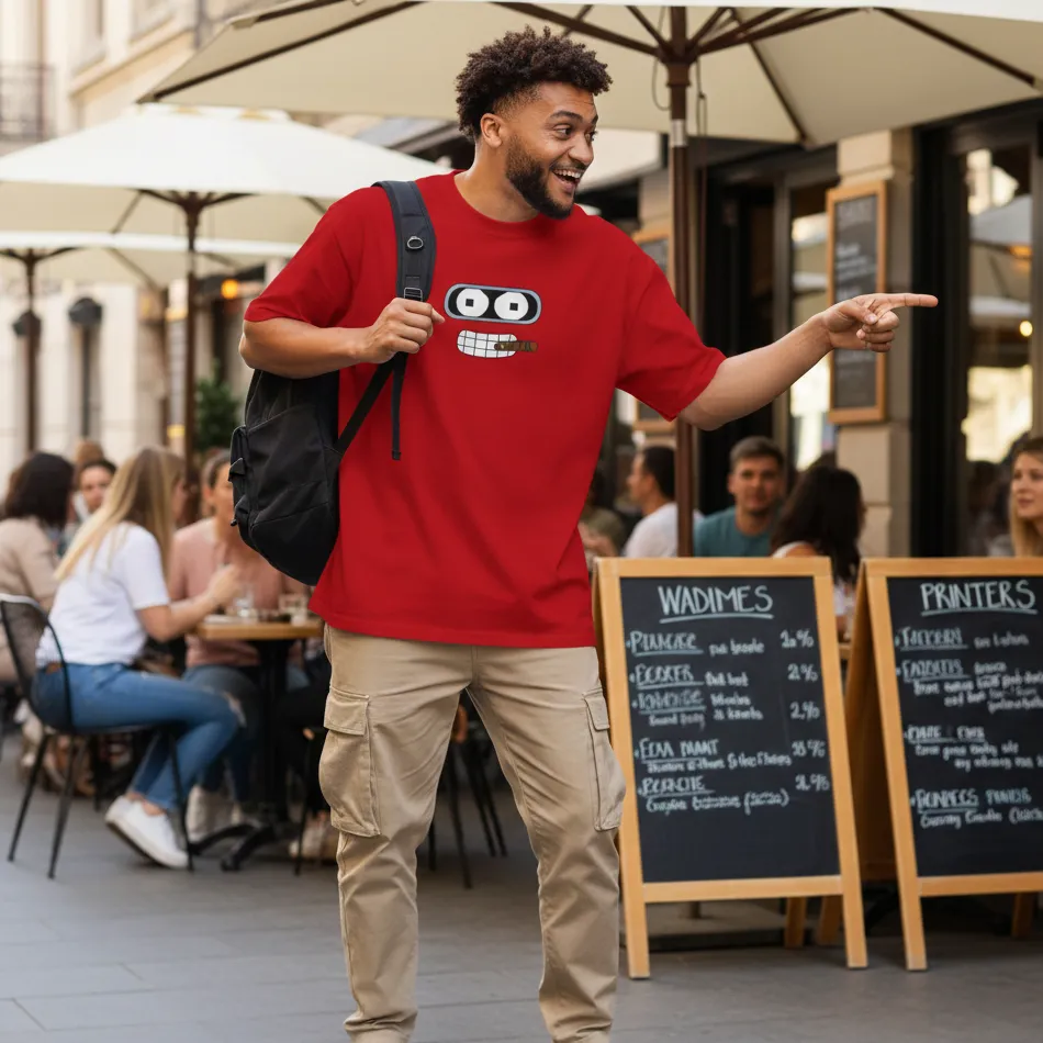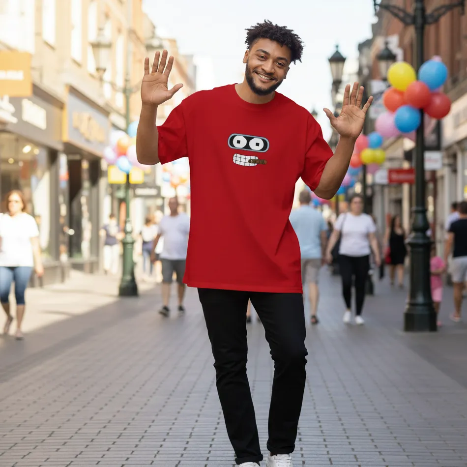 FAQs – Futurama Inspired Red Oversized T-Shirt – Eye and Teeth Graphic