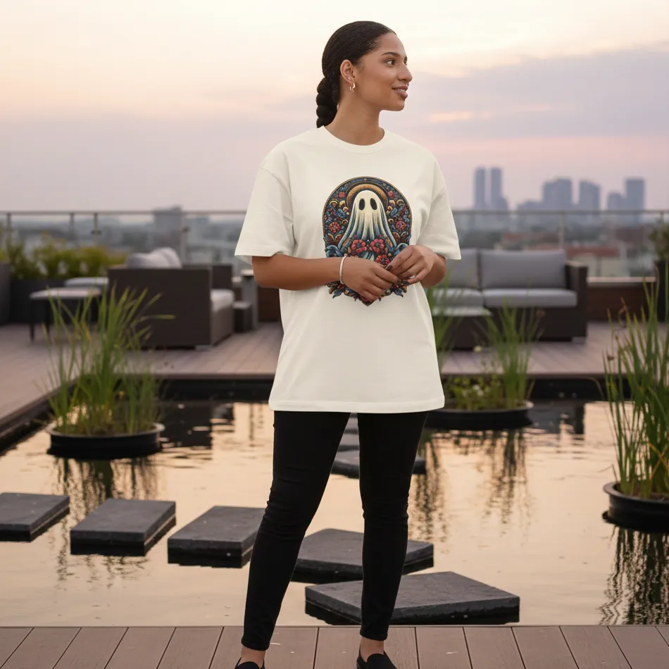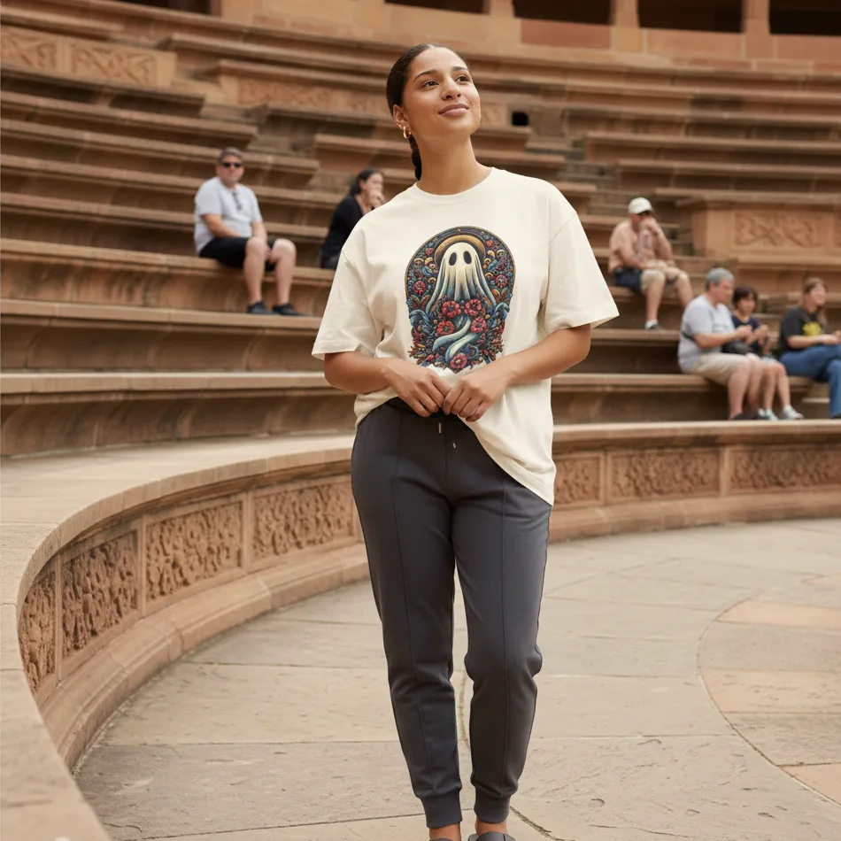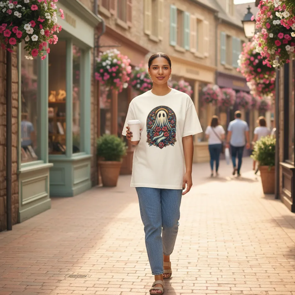 Channel subtle spooky energy with this Haunted inspired beige oversized t-shirt designed exclusively for women. Featuring a bold white ghost graphic, this piece captures mystery, mood, and modern oversized fashion in one effortless statement.