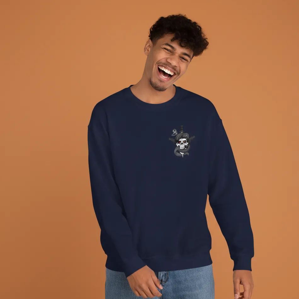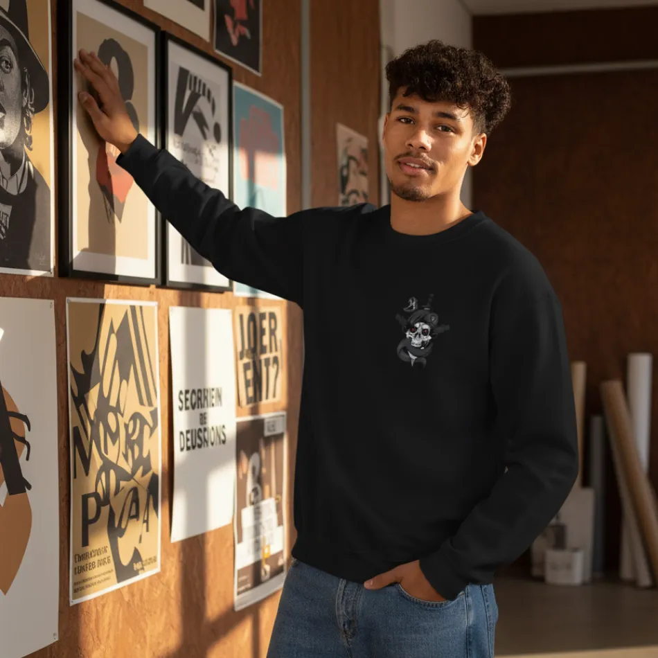 Armed forces inspired Black sweatshirt for men designed with a powerful skull graphic influenced by military-style symbolism and toughness.