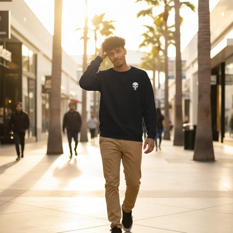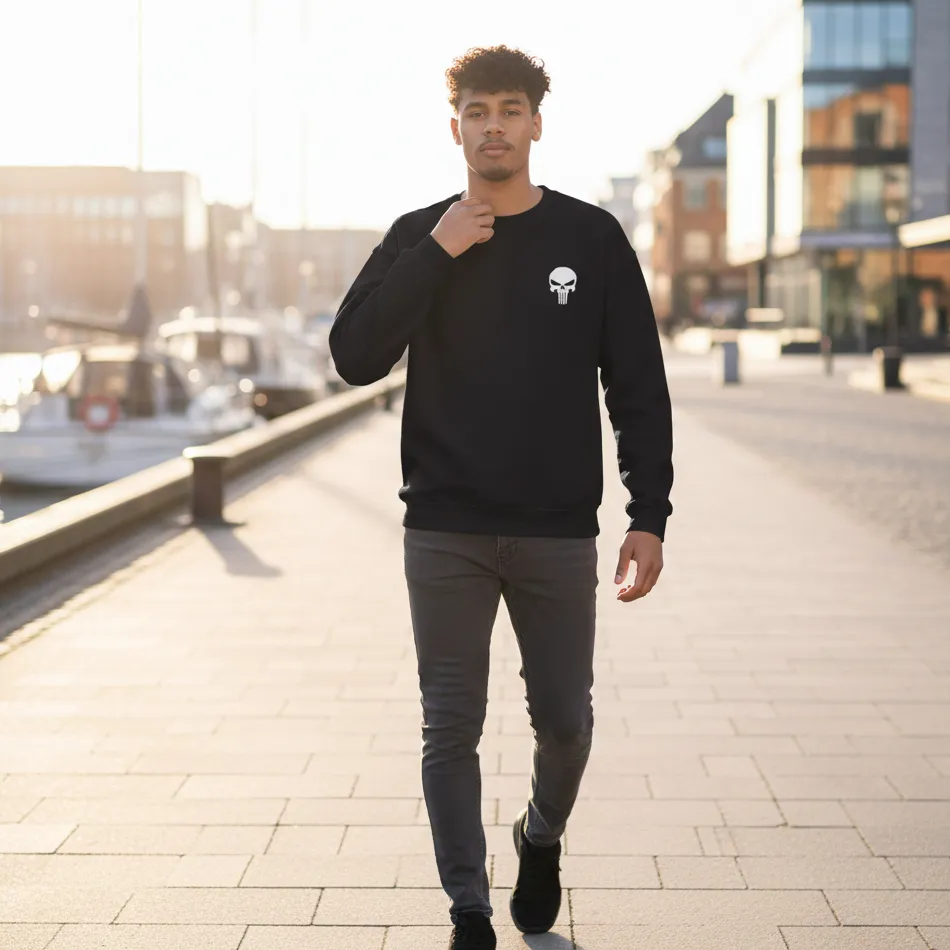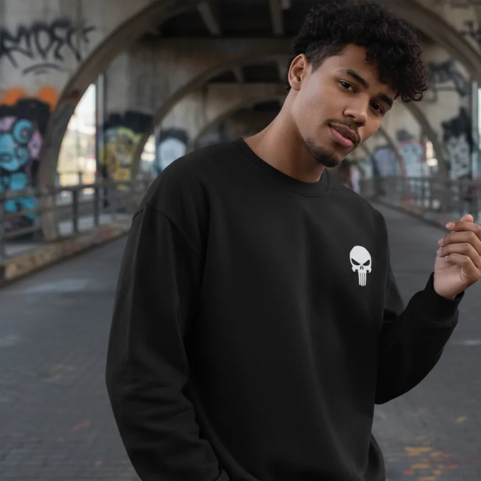 A call of duty inspired black sweatshirt for men featuring a bold punisher-style skull pocket logo. Comfortable, breathable, and designed for all-season casual wear.