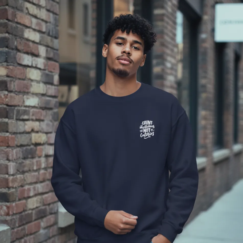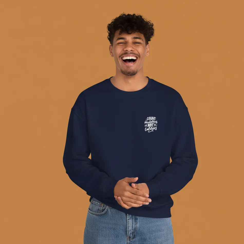 Count memories not calories Navy sweatshirt for Men designed with a clean, pocket-size text graphic that promotes a positive, carefree lifestyle.