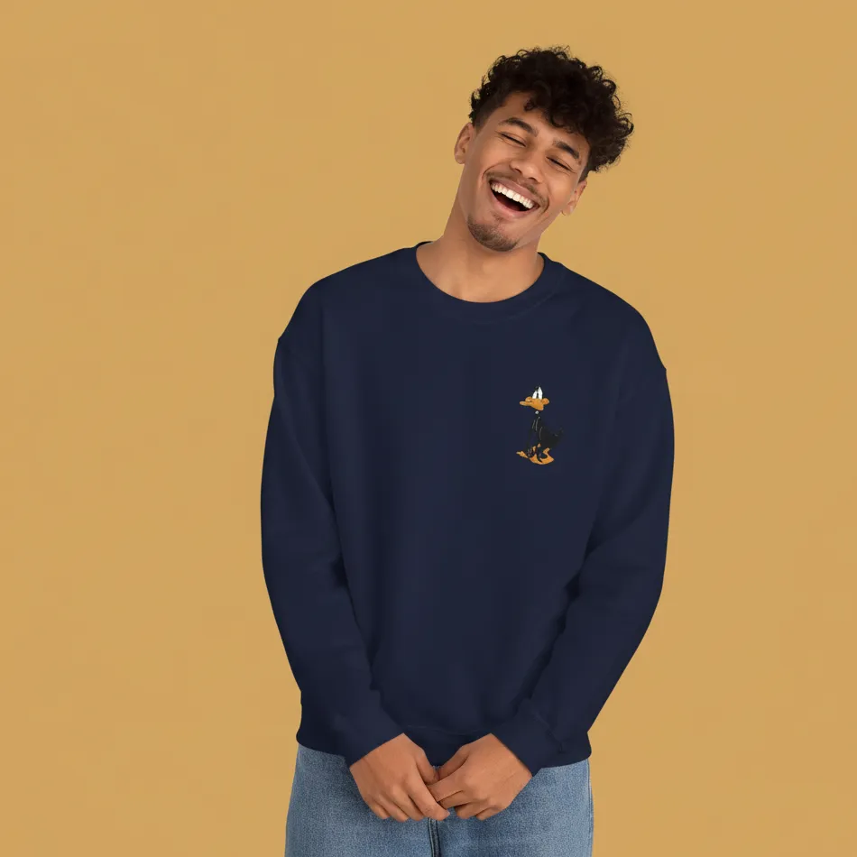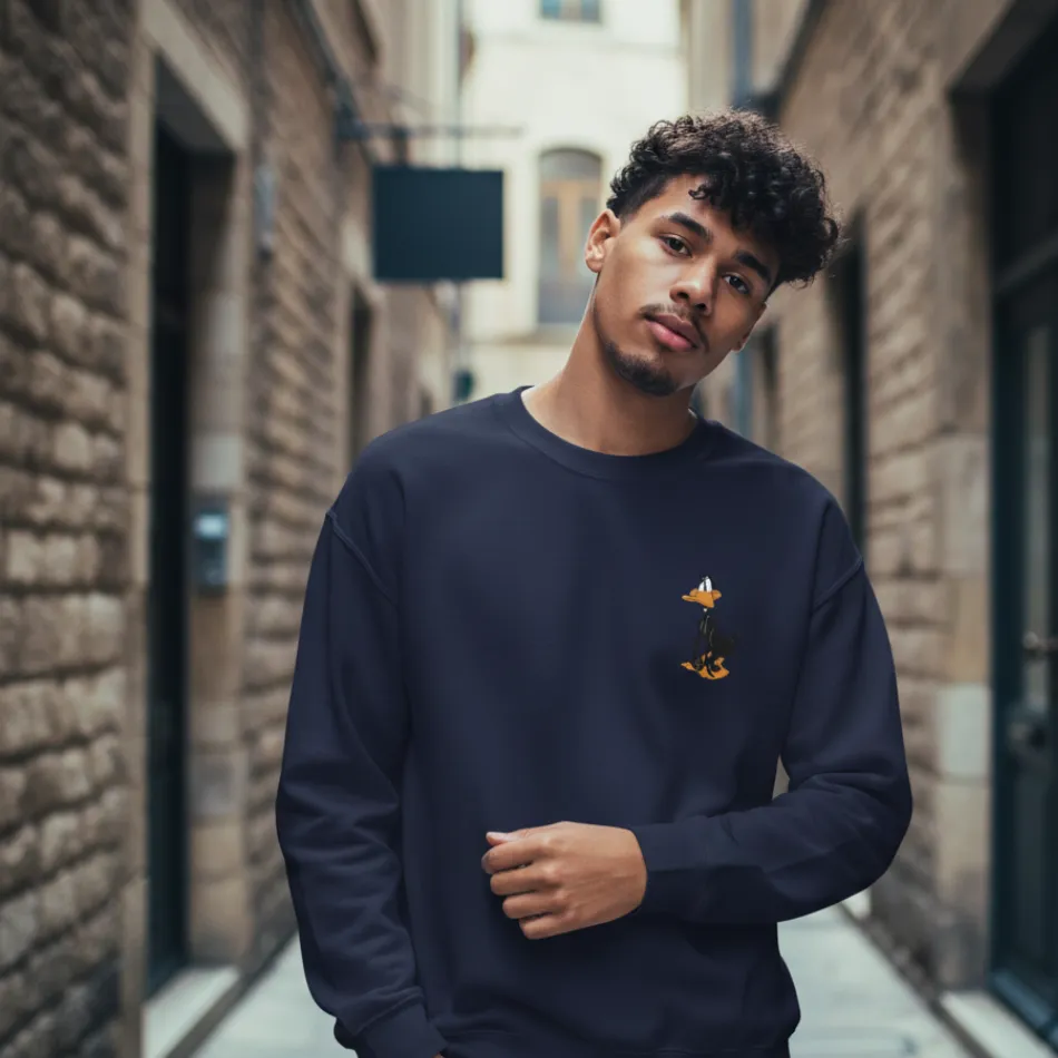 Daffy Duck inspired navy sweatshirt for men pocket graphic designed with a bold graphic inspired by the iconic Looney Tunes character, combining playful nostalgia with modern comfort.