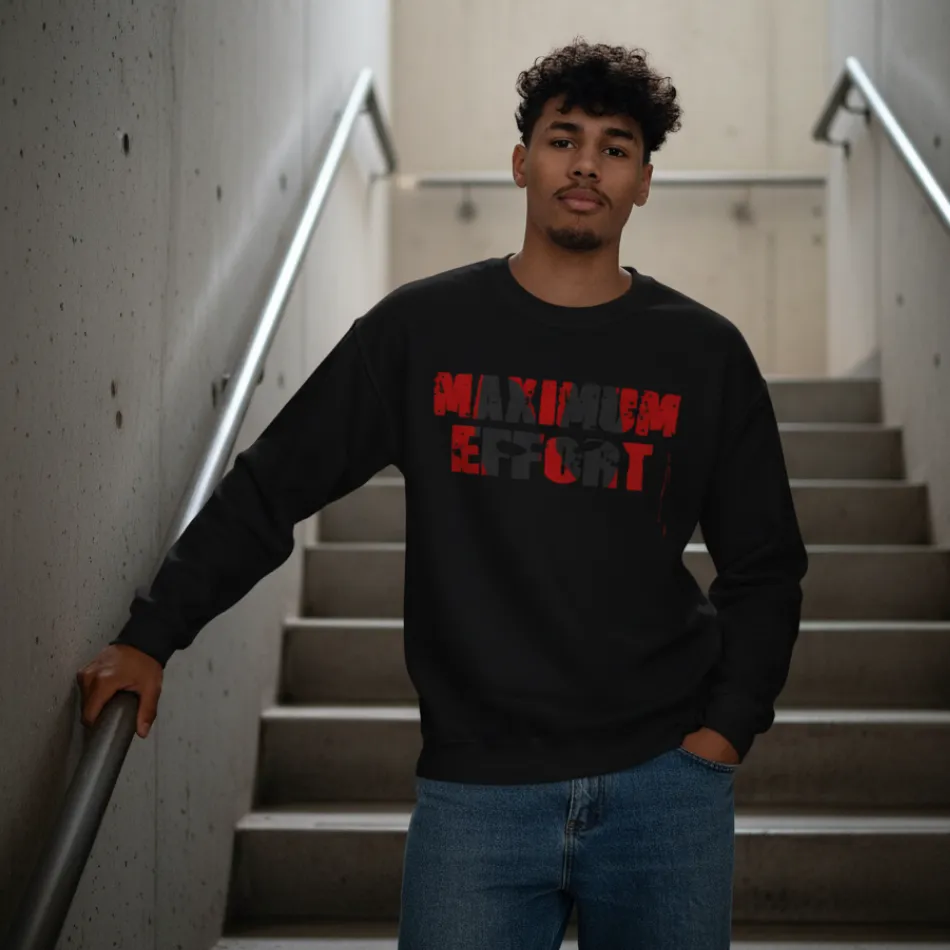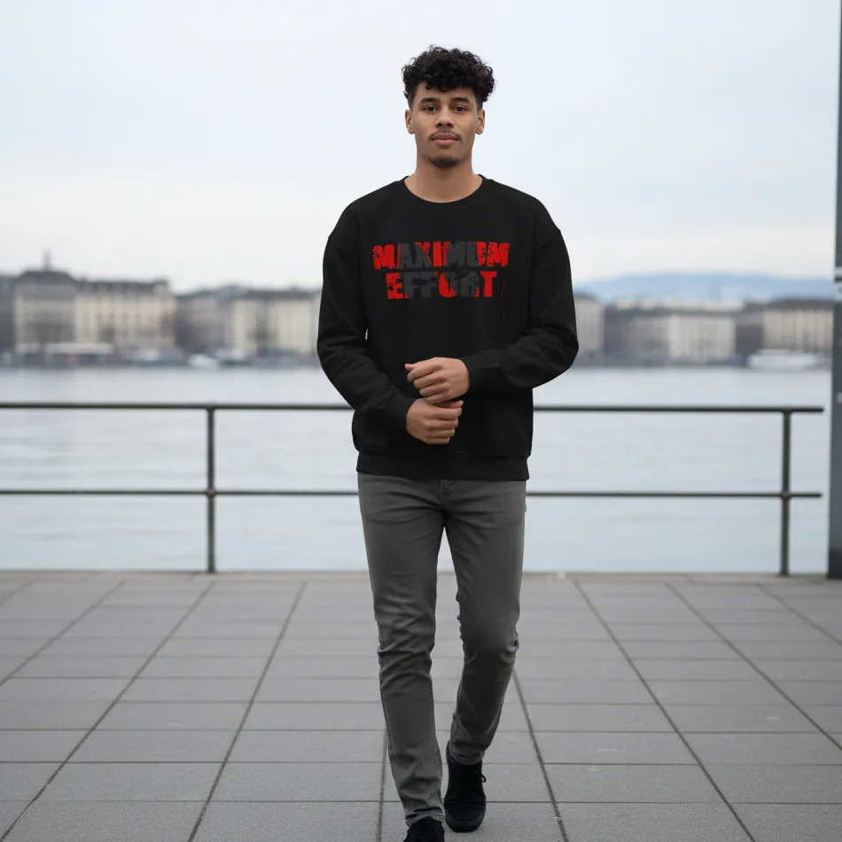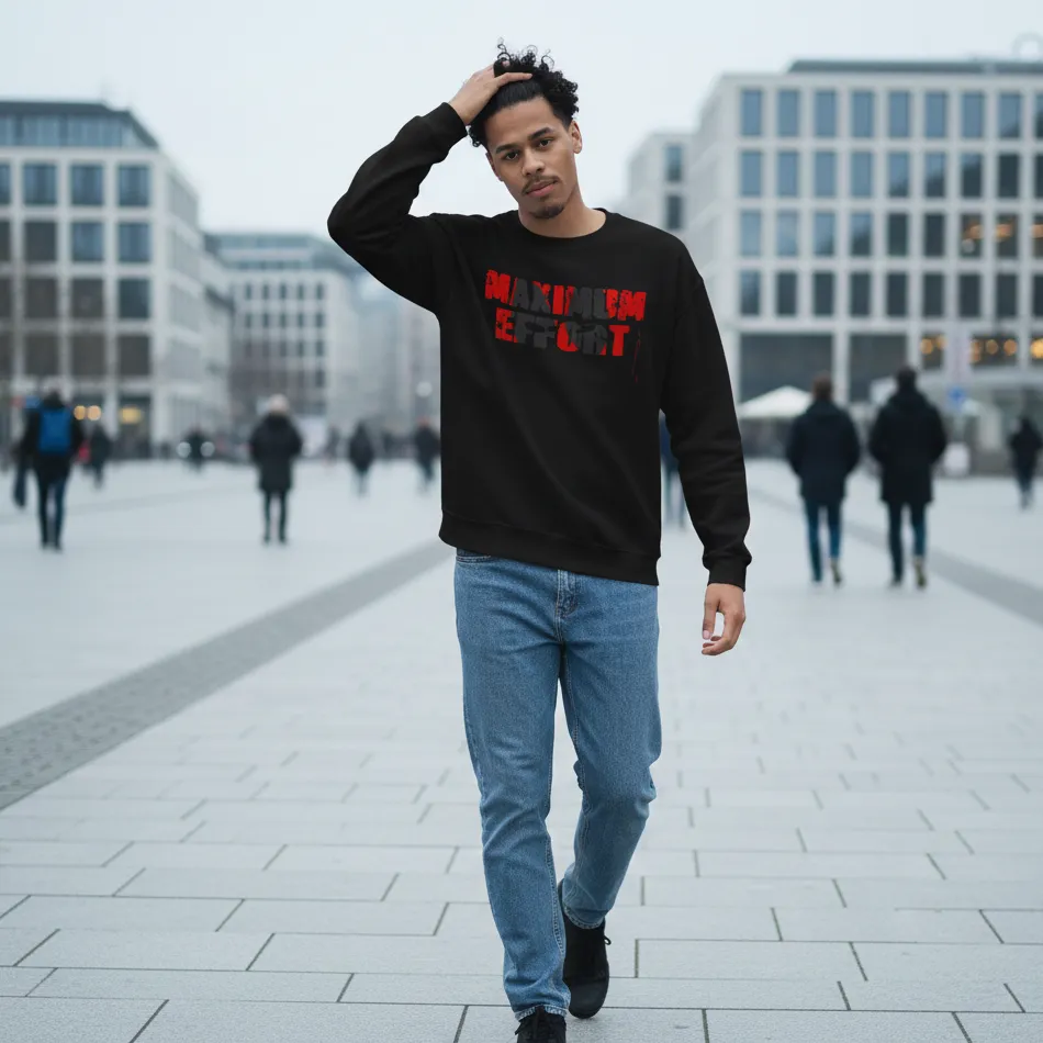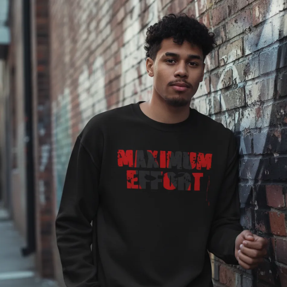 Deadpool inspired black sweatshirt for men designed with the iconic “Maximum Effort” text graphic inspired by the Marvel universe.