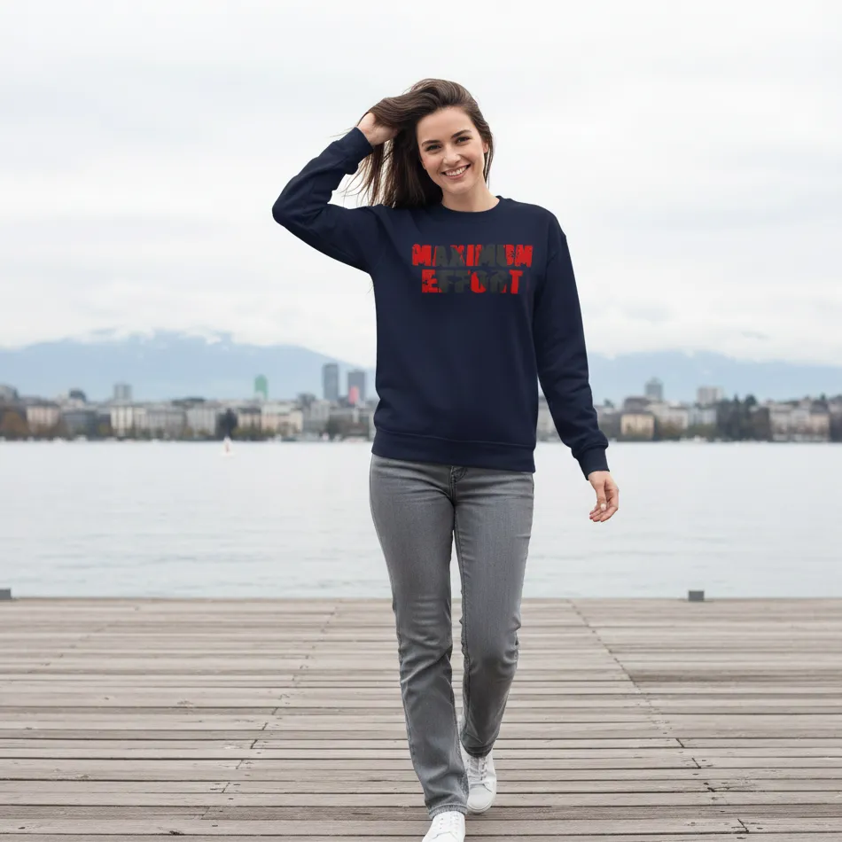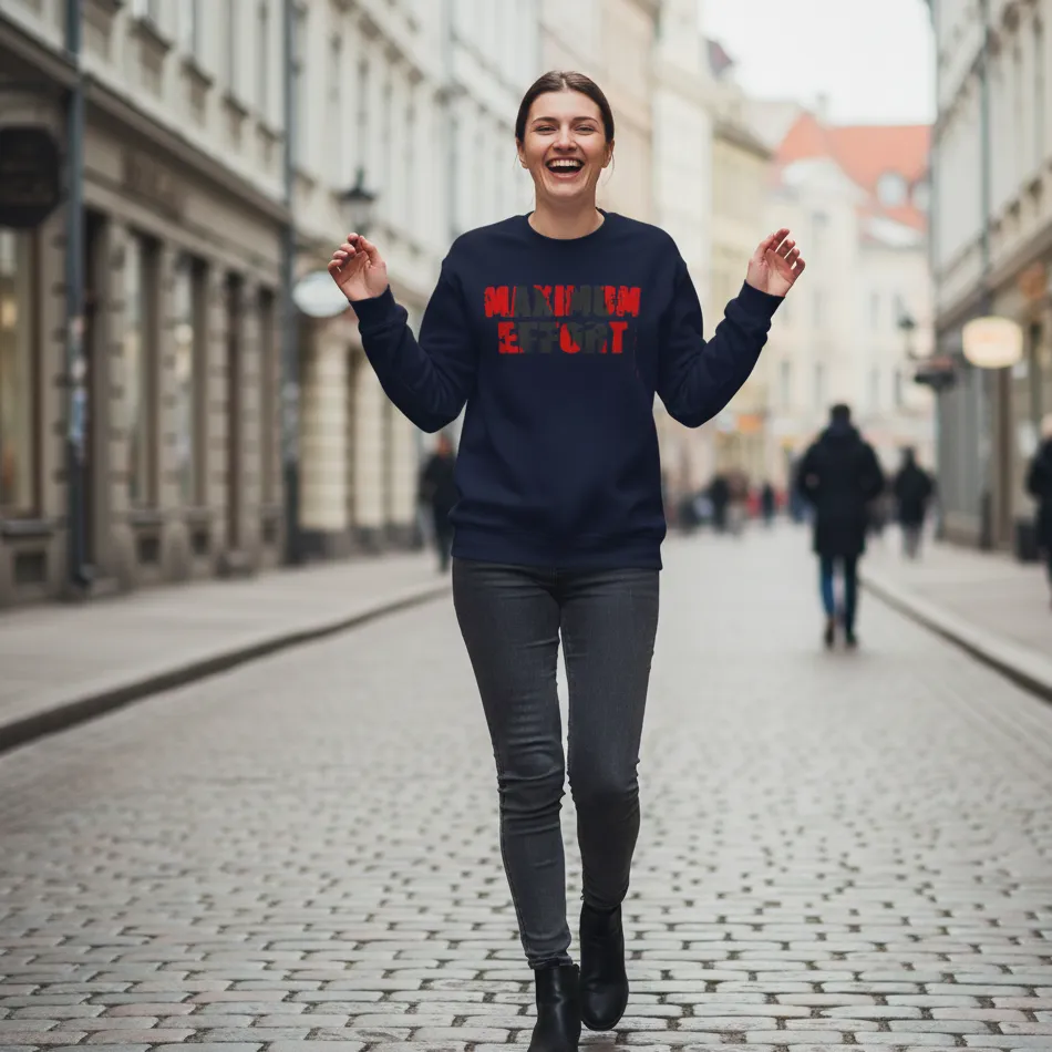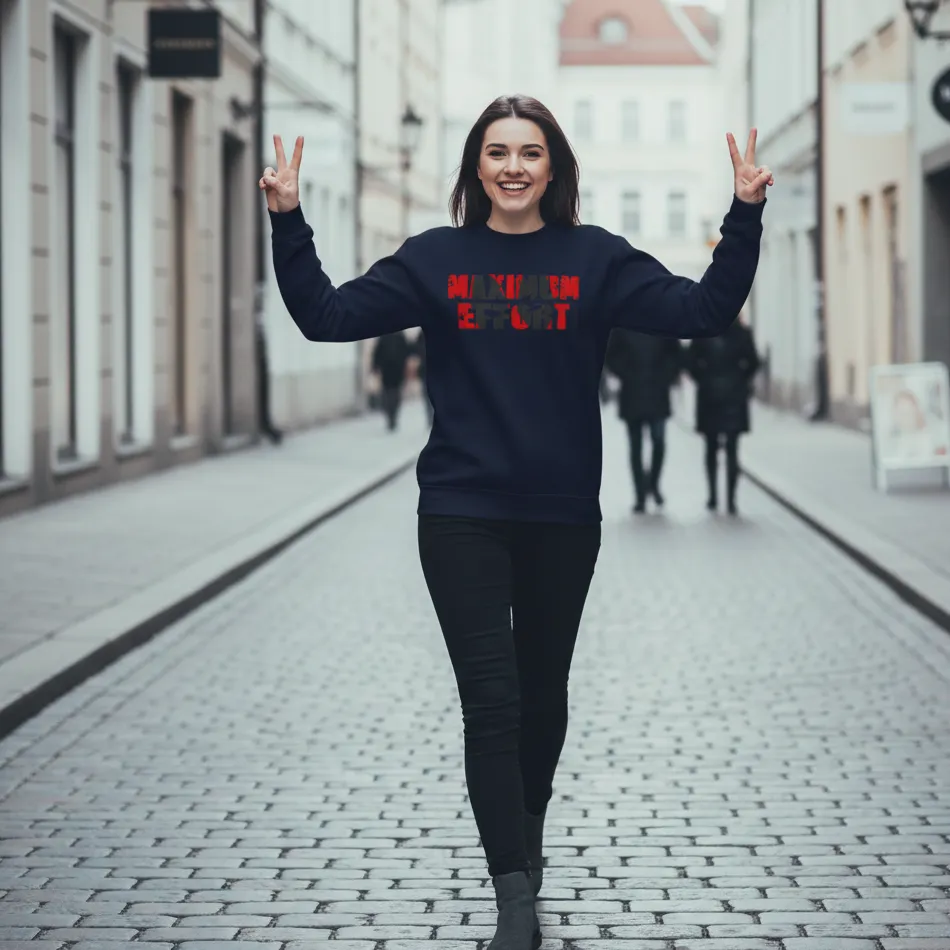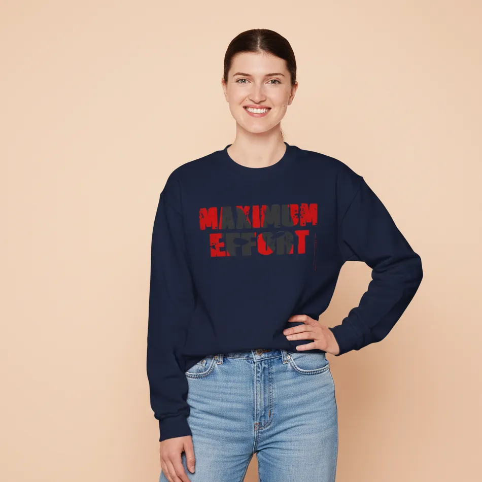 Deadpool inspired navy sweatshirt for women designed with a bold “Maximum Effort” text graphic inspired by the famous movie dialogue, blending fun pop-culture energy with modern comfort.