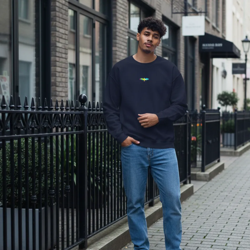 Freedom bird navy sweatshirt for men designed with a colourful flying bird graphic that represents freedom, movement, and individuality.