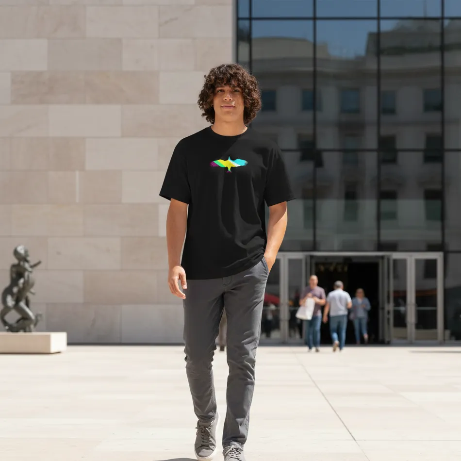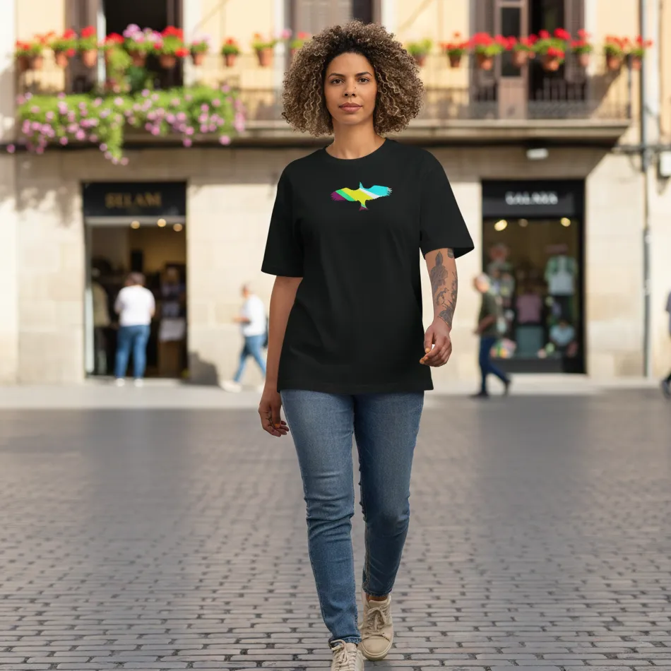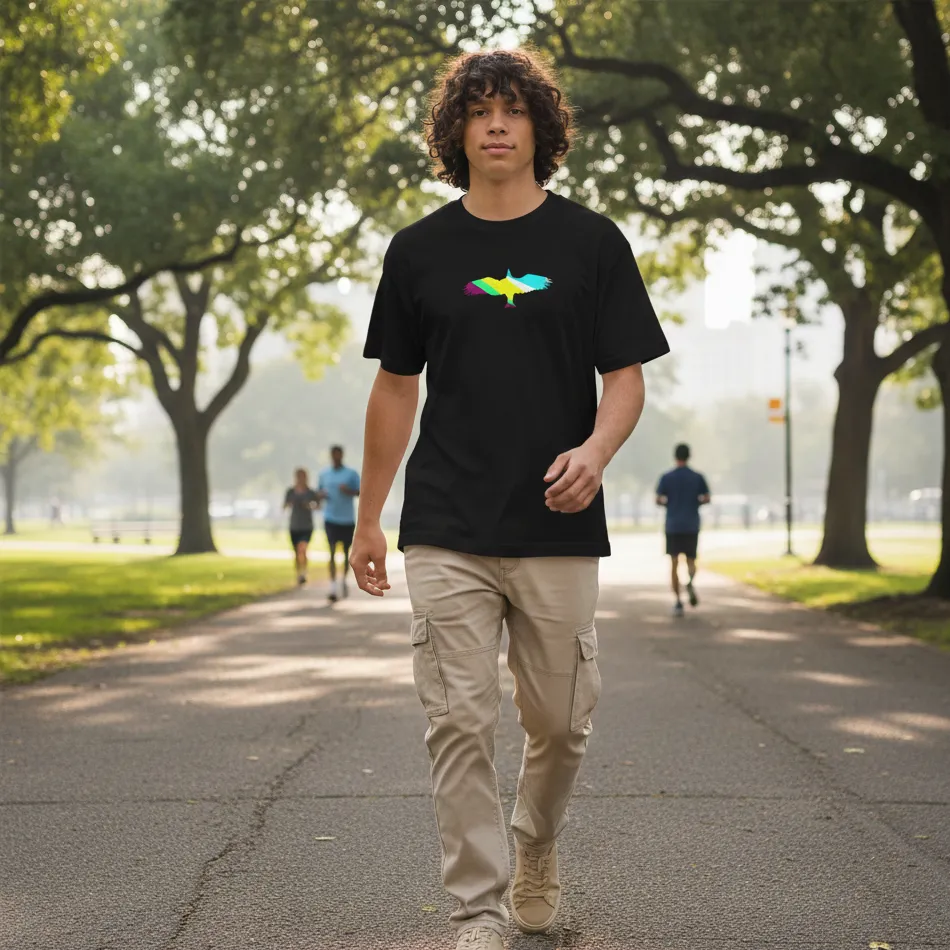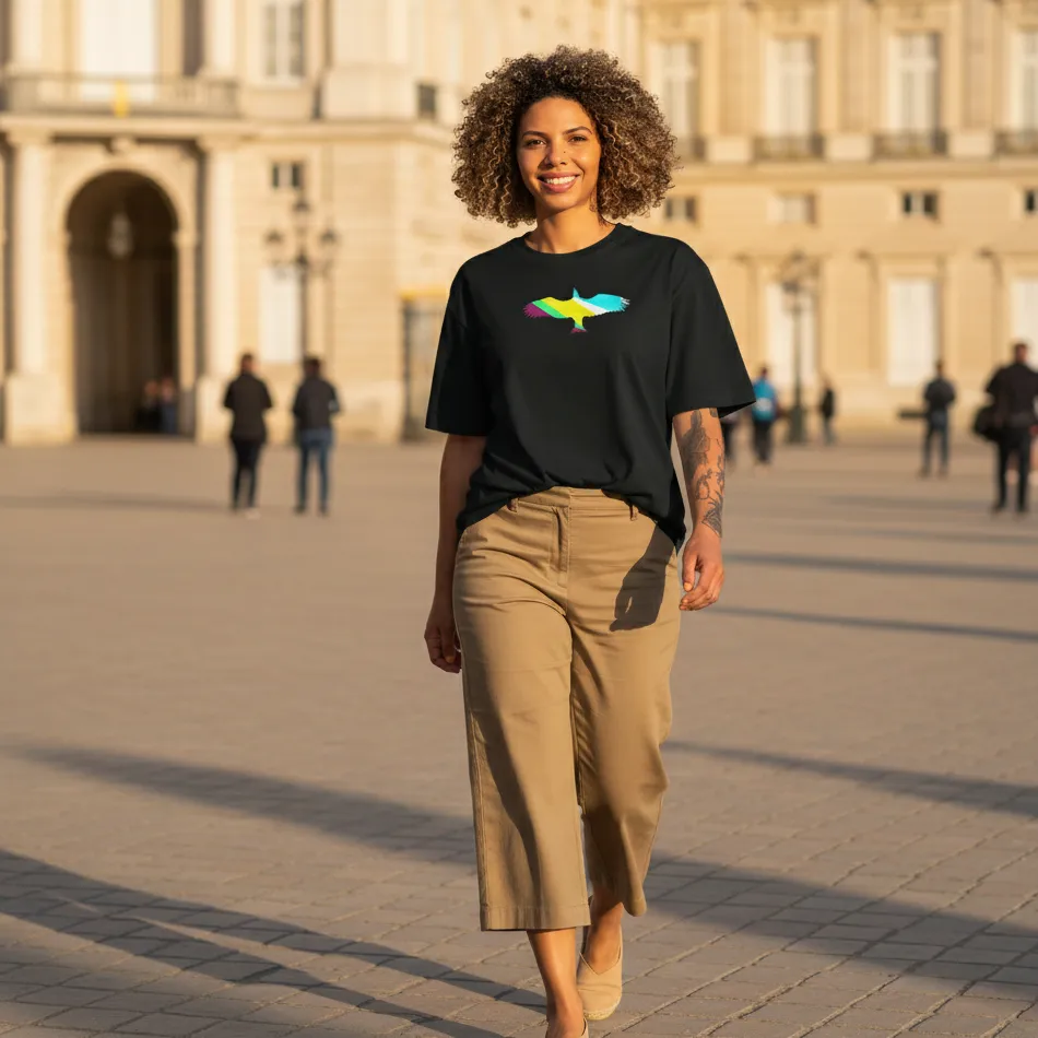 Celebrate strength, independence, and limitless energy with this freedom inspired black oversized t-shirt designed for men and women. The bird open wing logo symbolizes ambition, movement, and the courage to rise above limits — making it more than just a graphic tee.