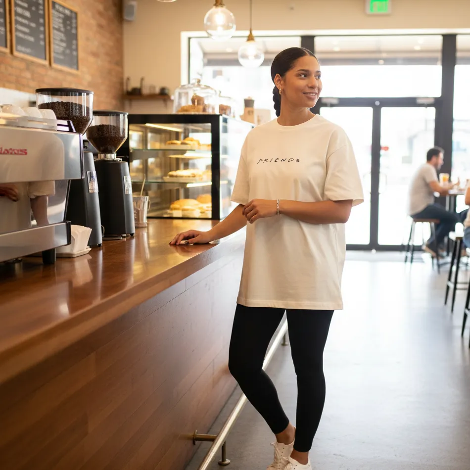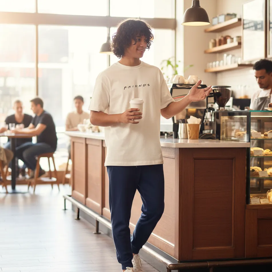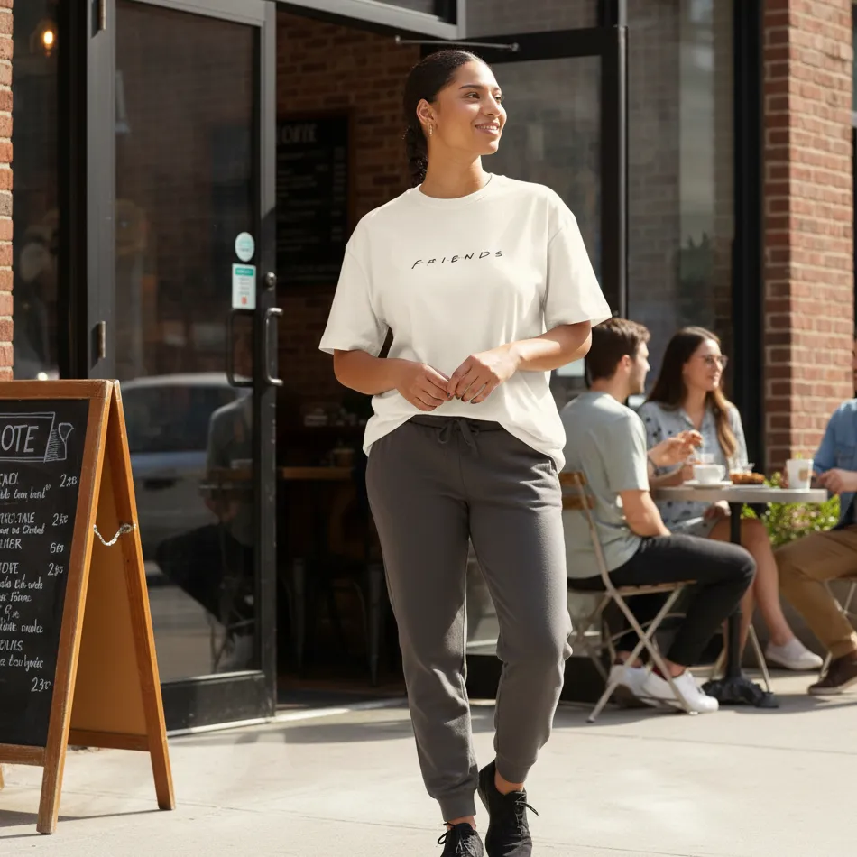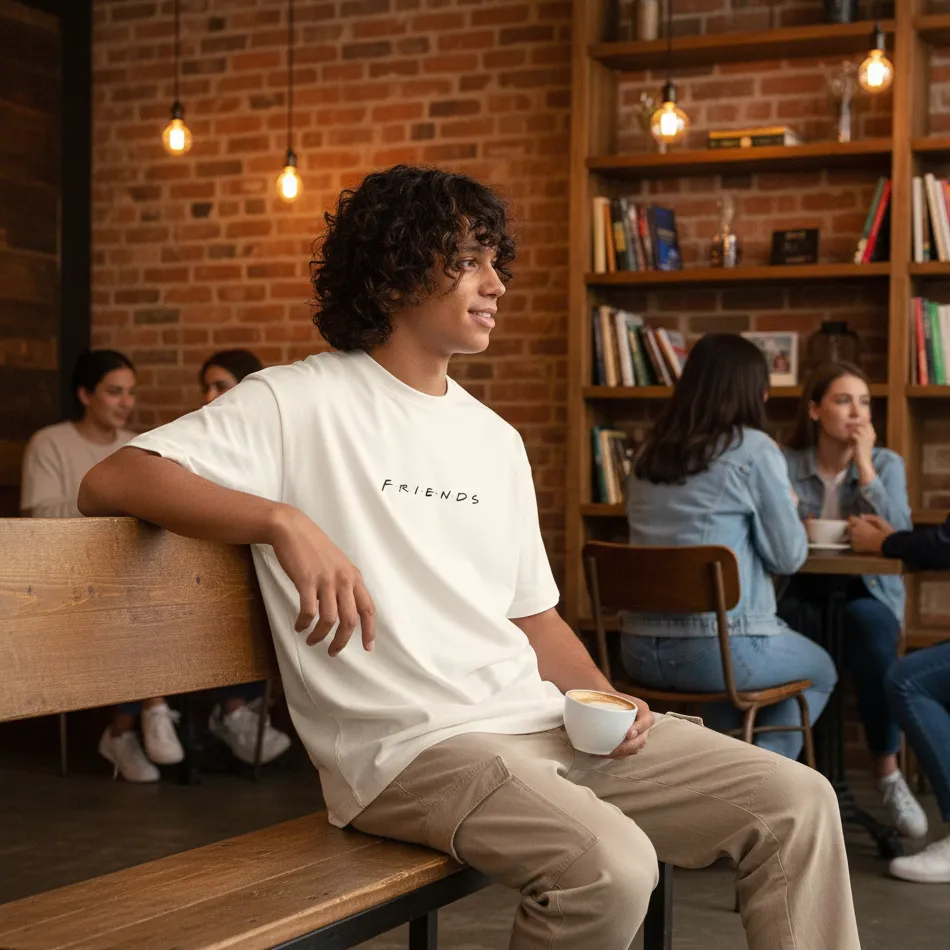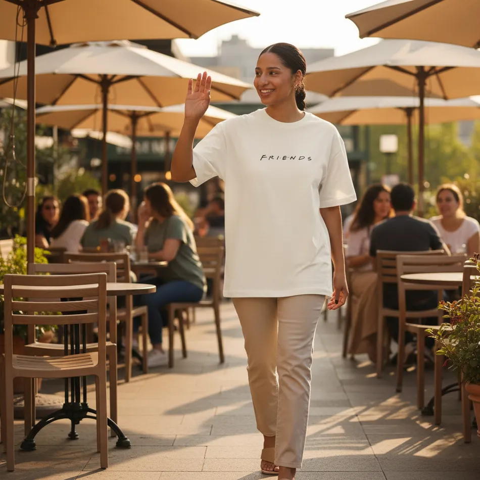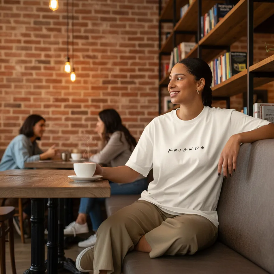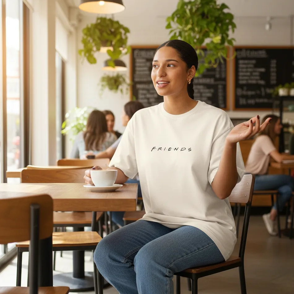 Absolutely. The oversized fit and Friends TV show beige text graphic are perfect for streetwear and fan-inspired looks.