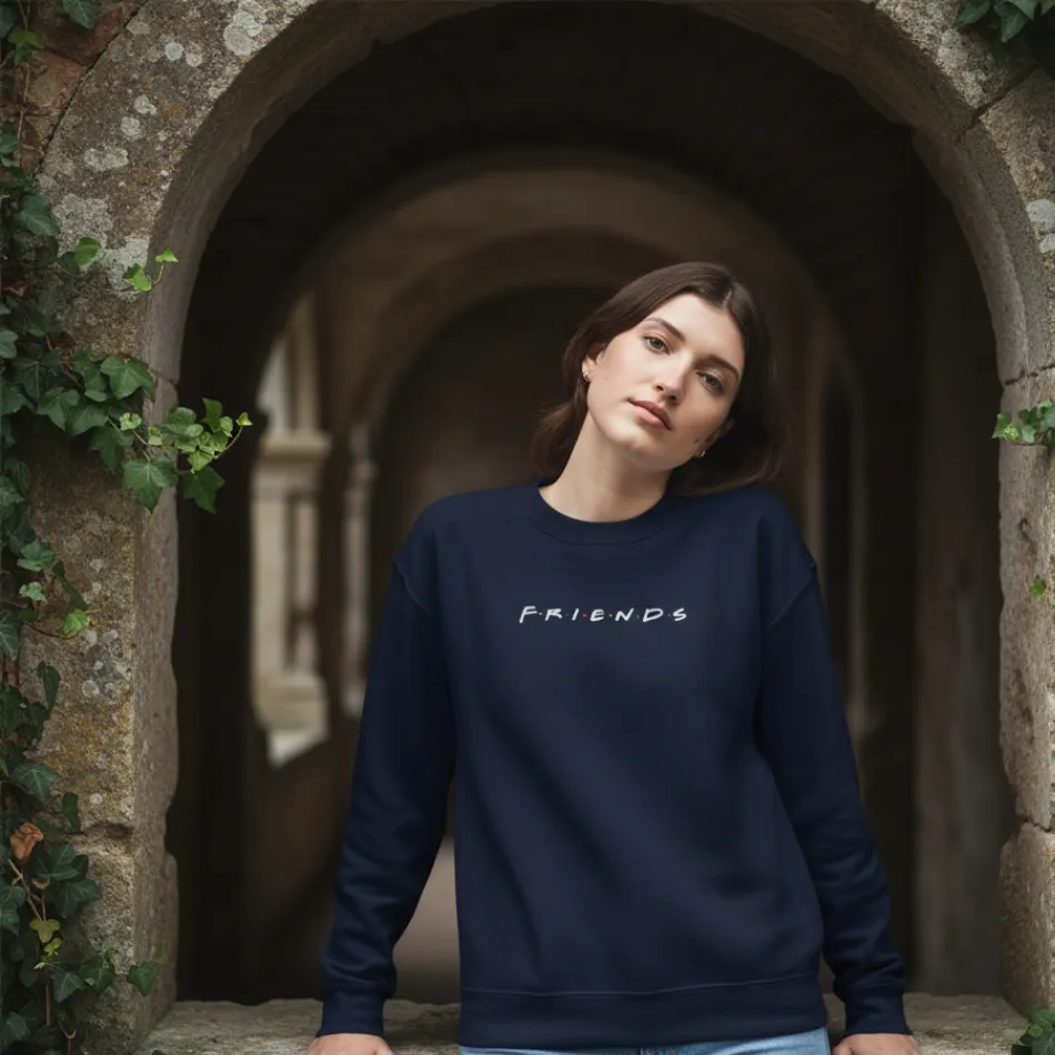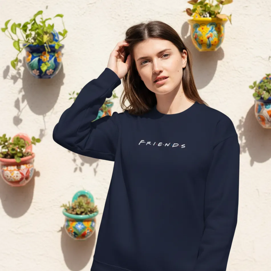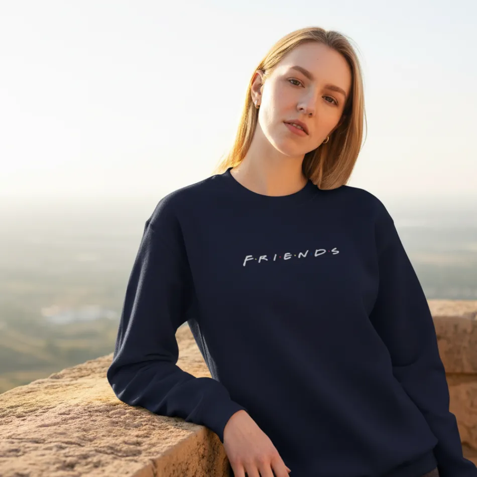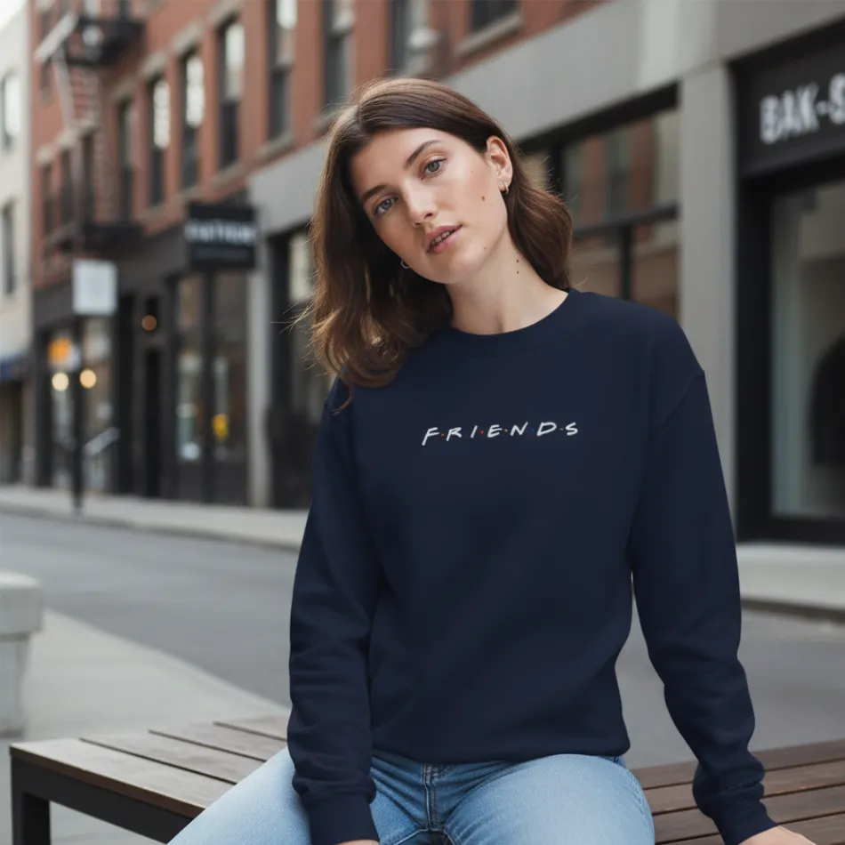 A friends inspired navy sweatshirt for women featuring the iconic text graphic from the famous TV show. Soft, breathable, and versatile, perfect for casual wear across winter, autumn, and mild rainy seasons.