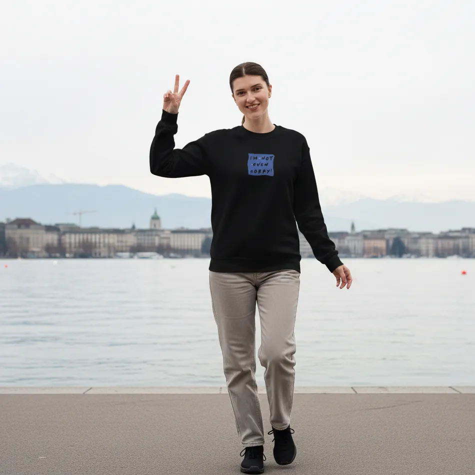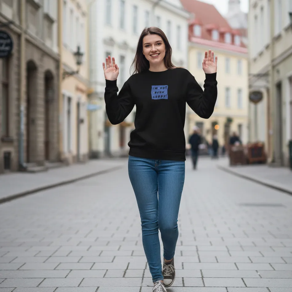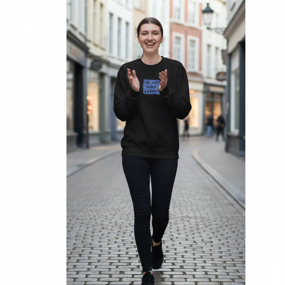 Friends inspired navy sweatshirt for women designed with the iconic “I Am Not Even Sorry” quote graphic inspired by a legendary 90s sitcom.