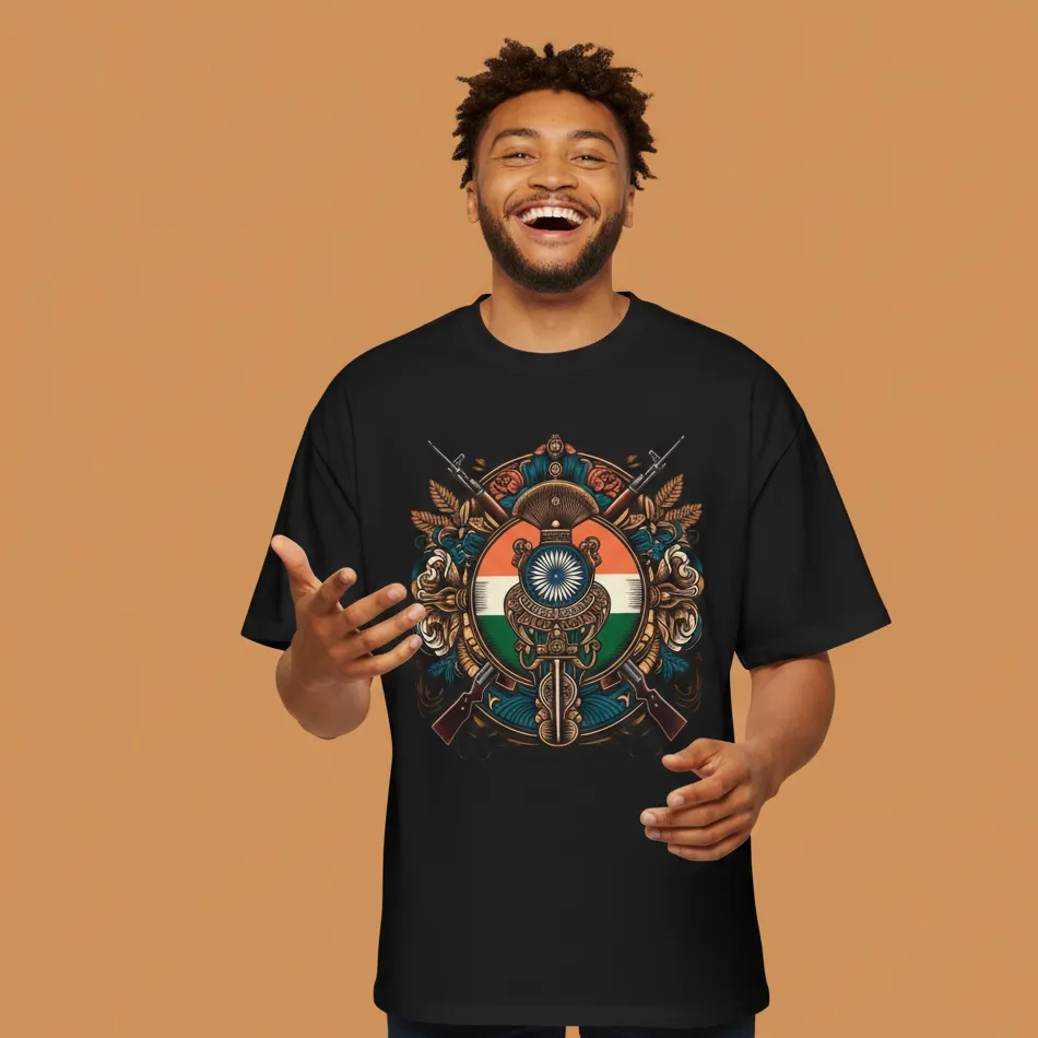 Inspired by the strength and unity symbolized by the Ashoka Chakra, this Ashok Chakra black oversized t-shirt represents pride, courage, and timeless patriotism. Designed for men who carry their nation in their heart, this t-shirt transforms national spirit into everyday style.