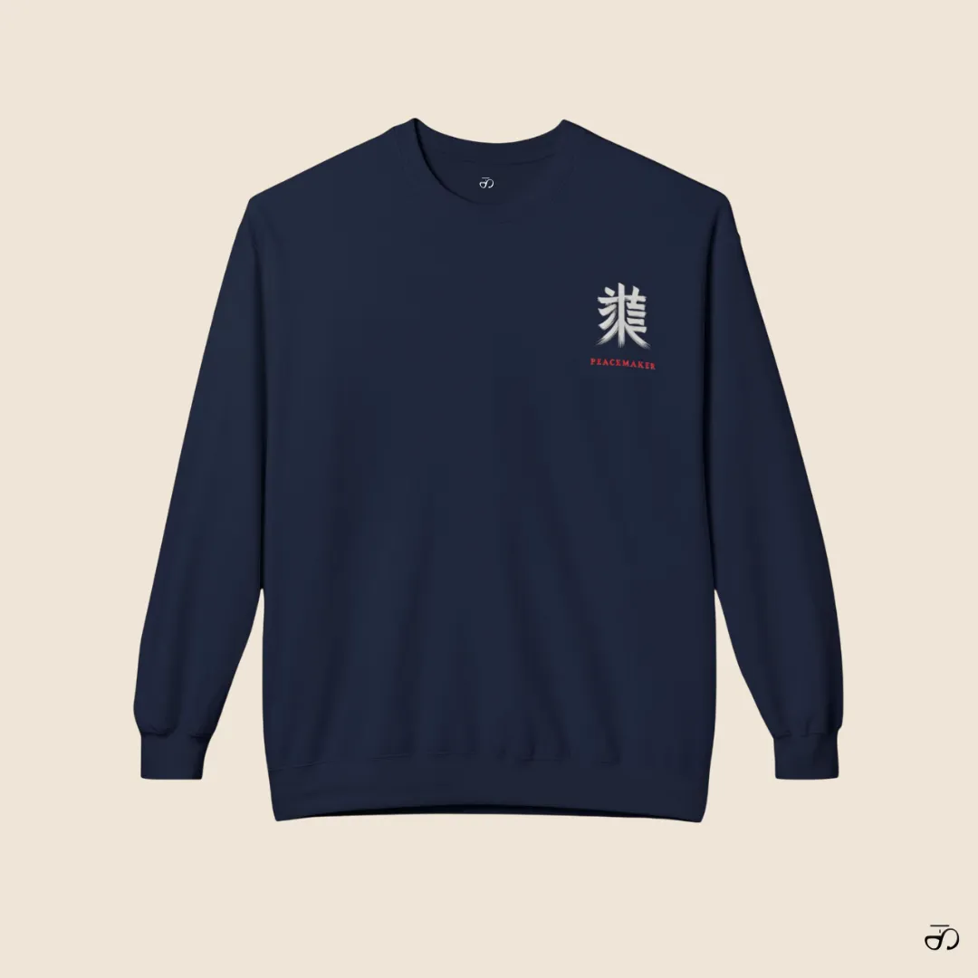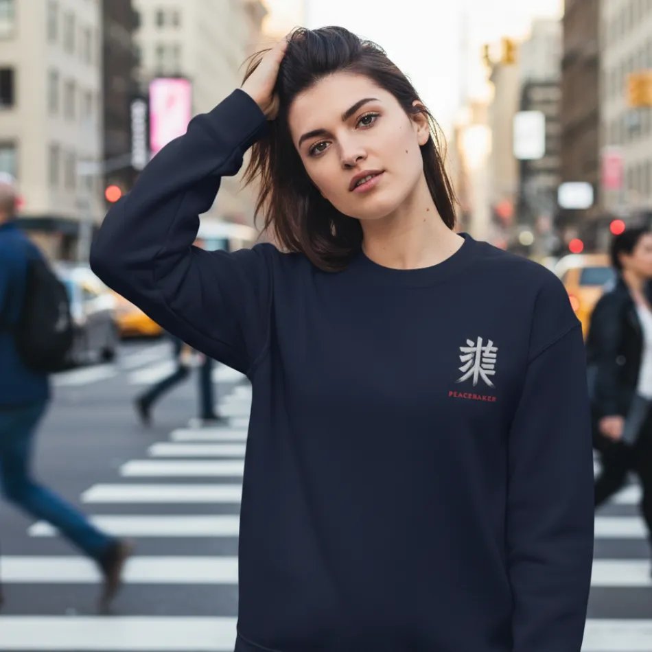 Japanese inspired navy sweatshirt for women designed with a unique graphic of the Japanese word meaning “Piecemaker,” blending minimalistic elegance with modern comfort.