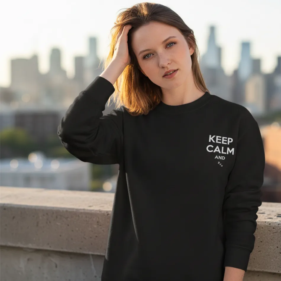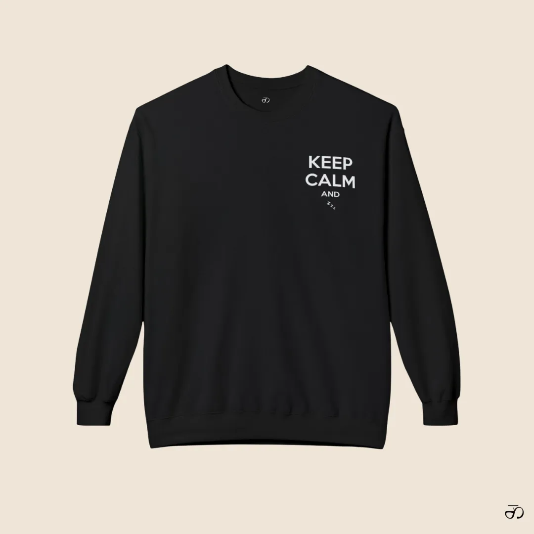 A keep calm and sleep black sweatshirt for women featuring a small pocket-area text design. Minimal, cozy, and breathable, perfect for relaxed daily wear and effortless styling.