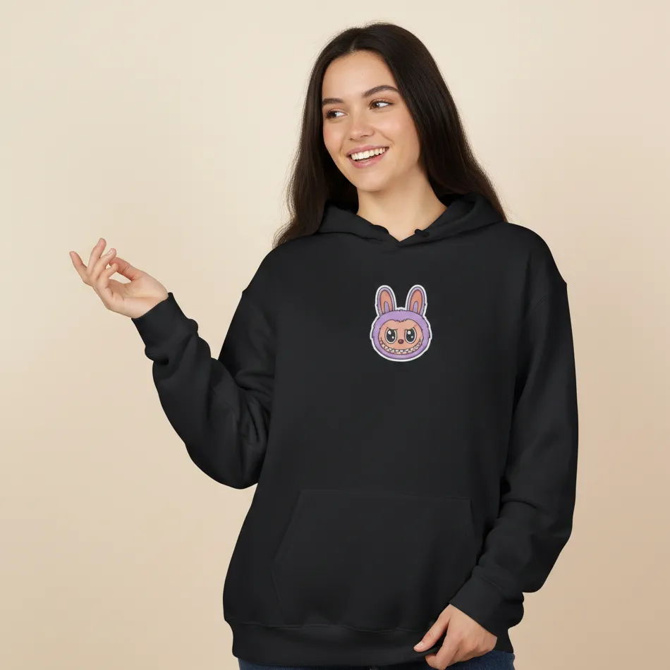 A Labubu Doll inspired black hoodie for women featuring a cute pink version graphic. Soft, breathable, and easy to layer, this hoodie is perfect for everyday wear across winter, autumn, and mild rainy seasons.