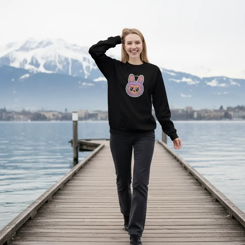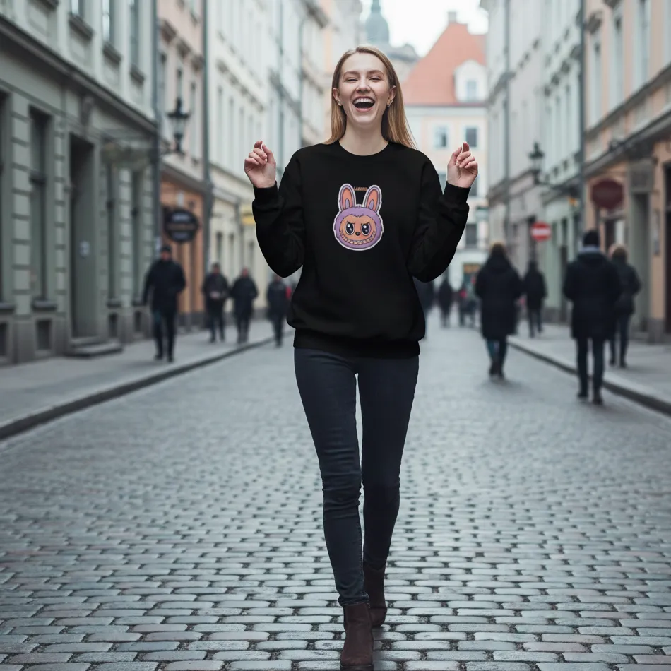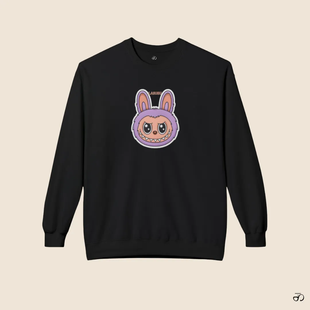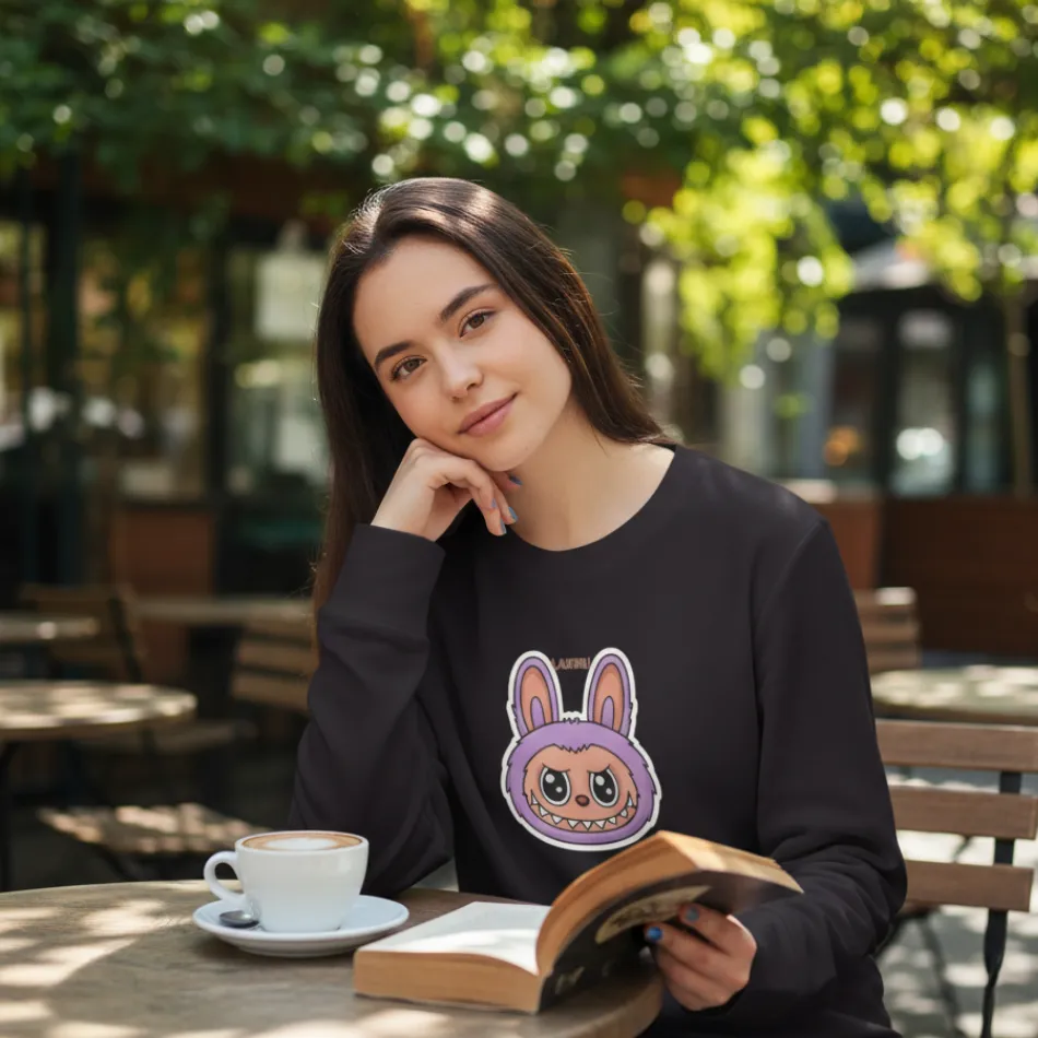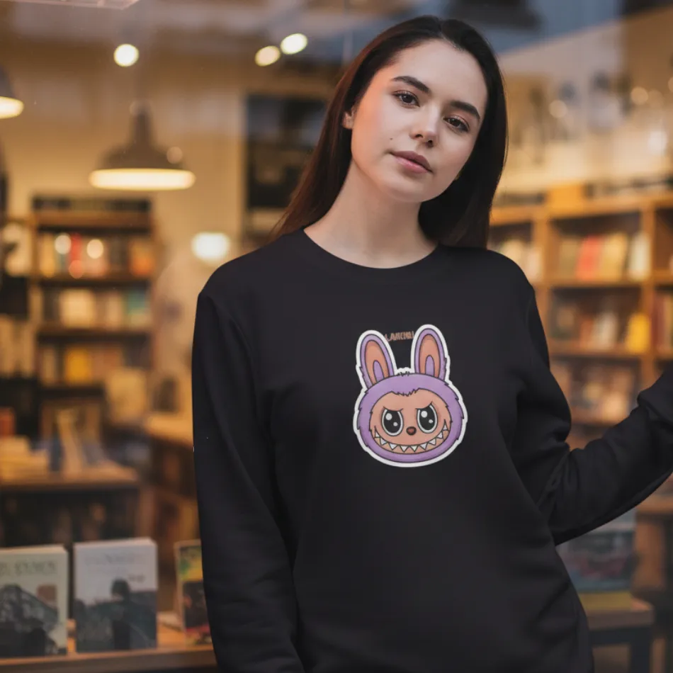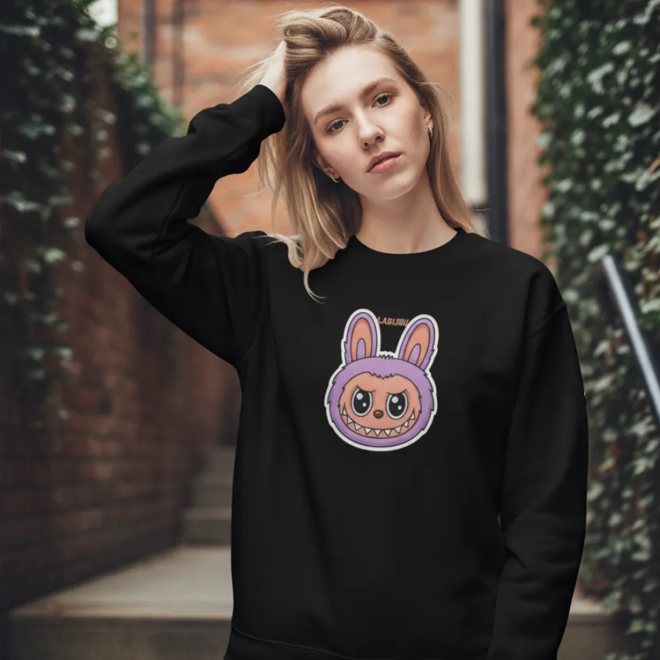 Labubu doll inspired black sweatshirt for women designed with a cute, expressive designer toy graphic that blends playful aesthetics with modern streetwear fashion.