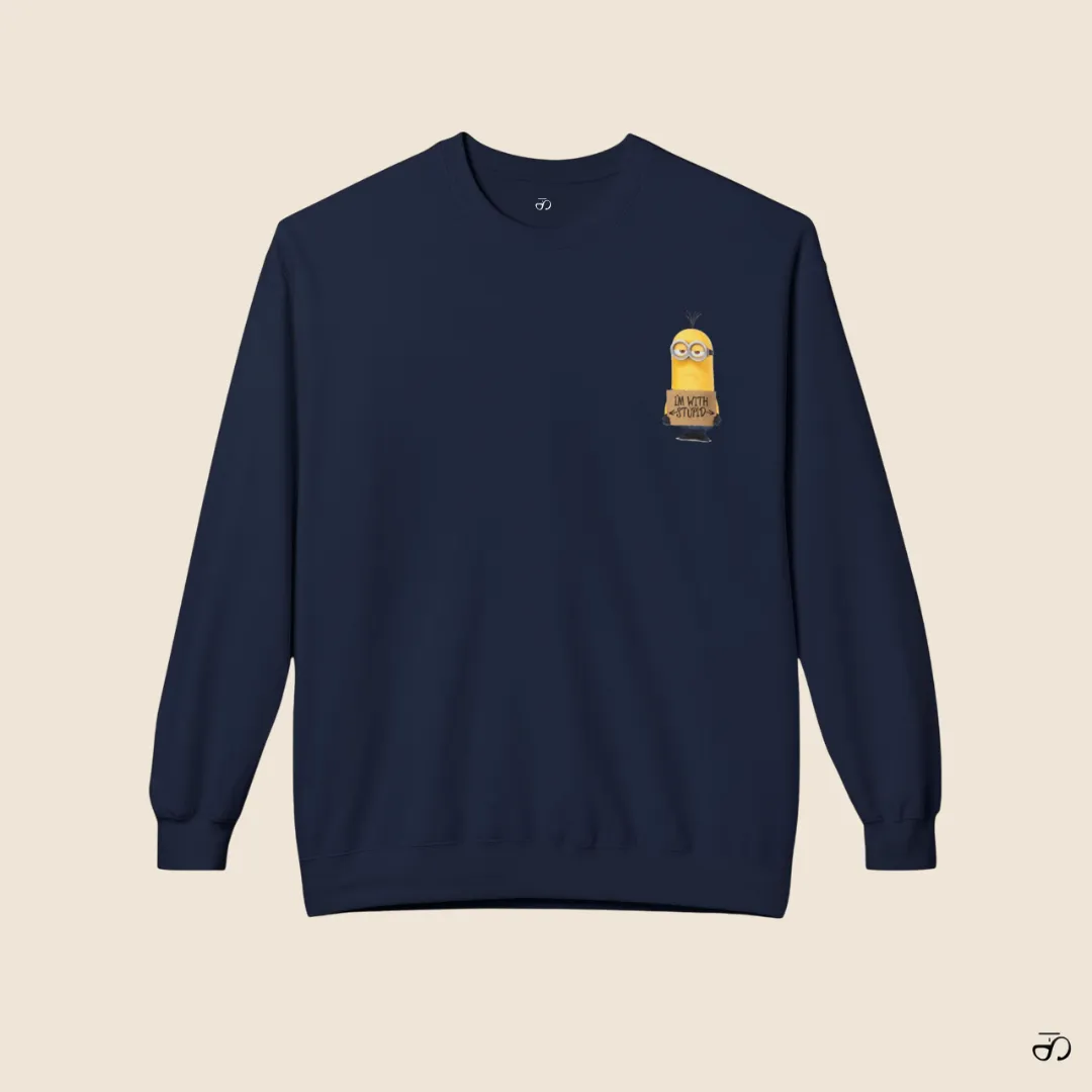 Minions inspired navy sweatshirt for women designed with a pocket-size cartoon graphic and fun text inspired by iconic animated characters.