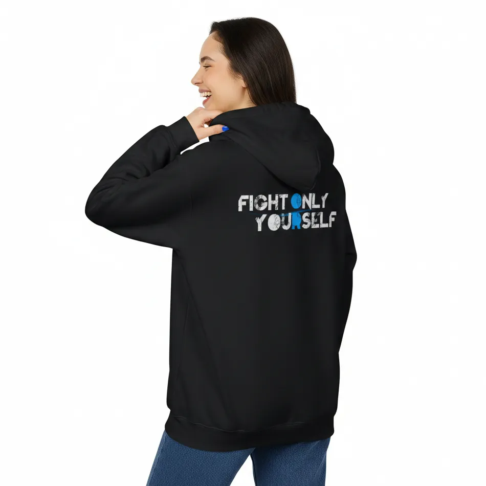 Motivational fight text black hoodie for women featuring a bold inspirational graphic that represents inner strength, resilience, and determination.