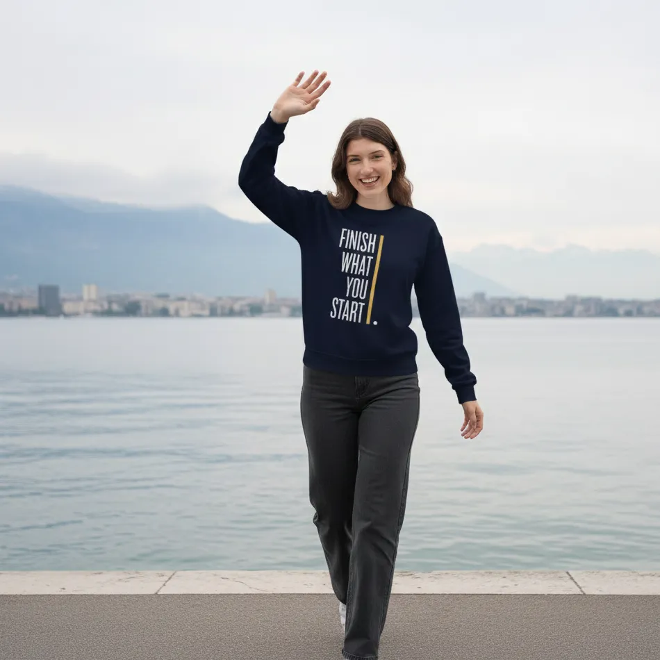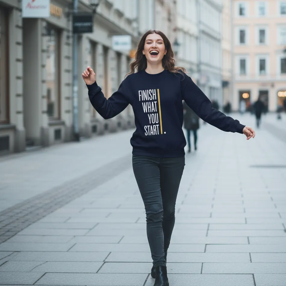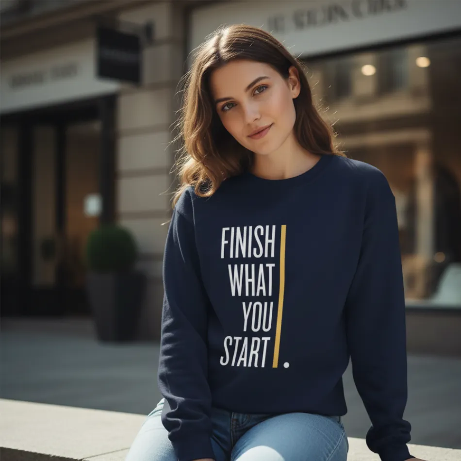 A motivational text graphic navy sweatshirt for women featuring “Finish What You Have Started” design. Soft, breathable, and easy to layer, perfect for everyday wear across winter, autumn, and mild rainy seasons.
