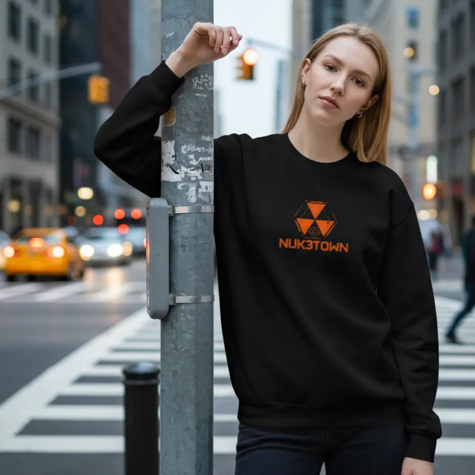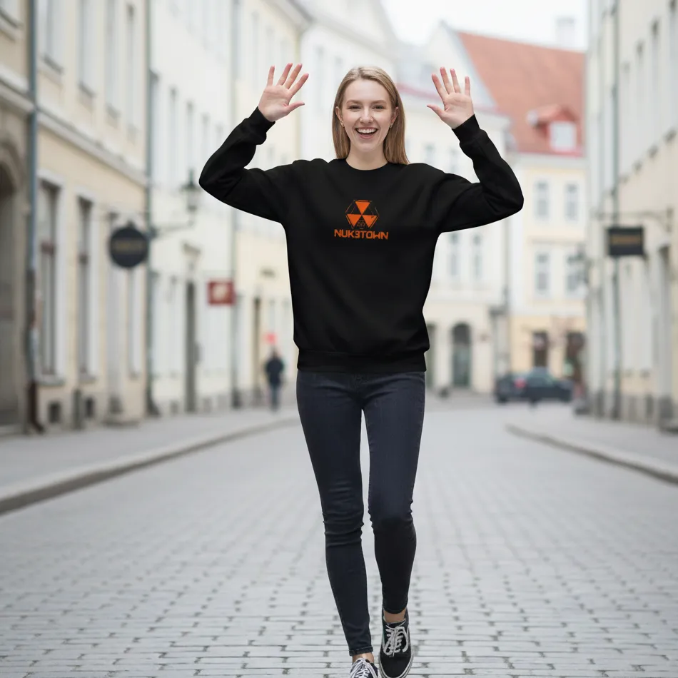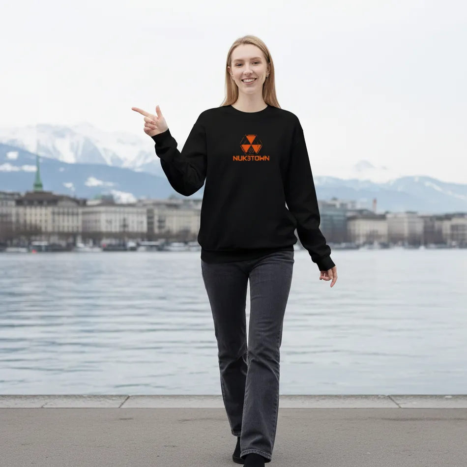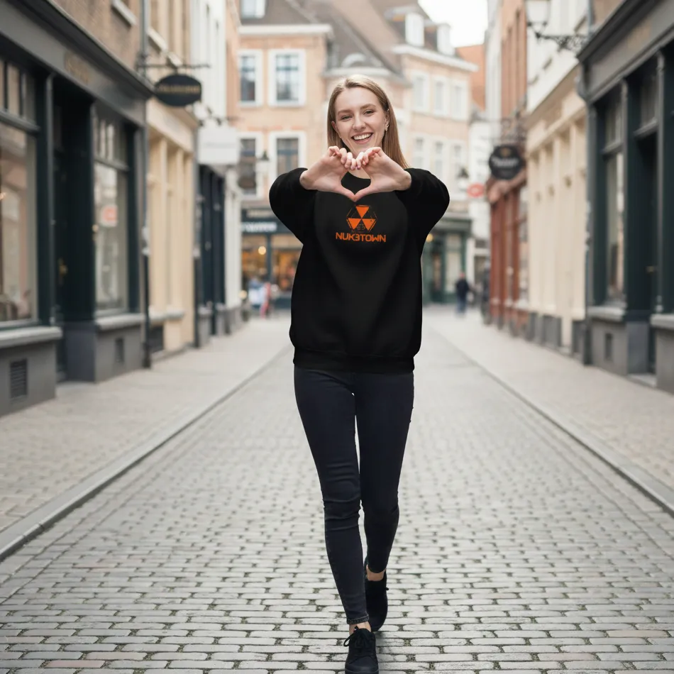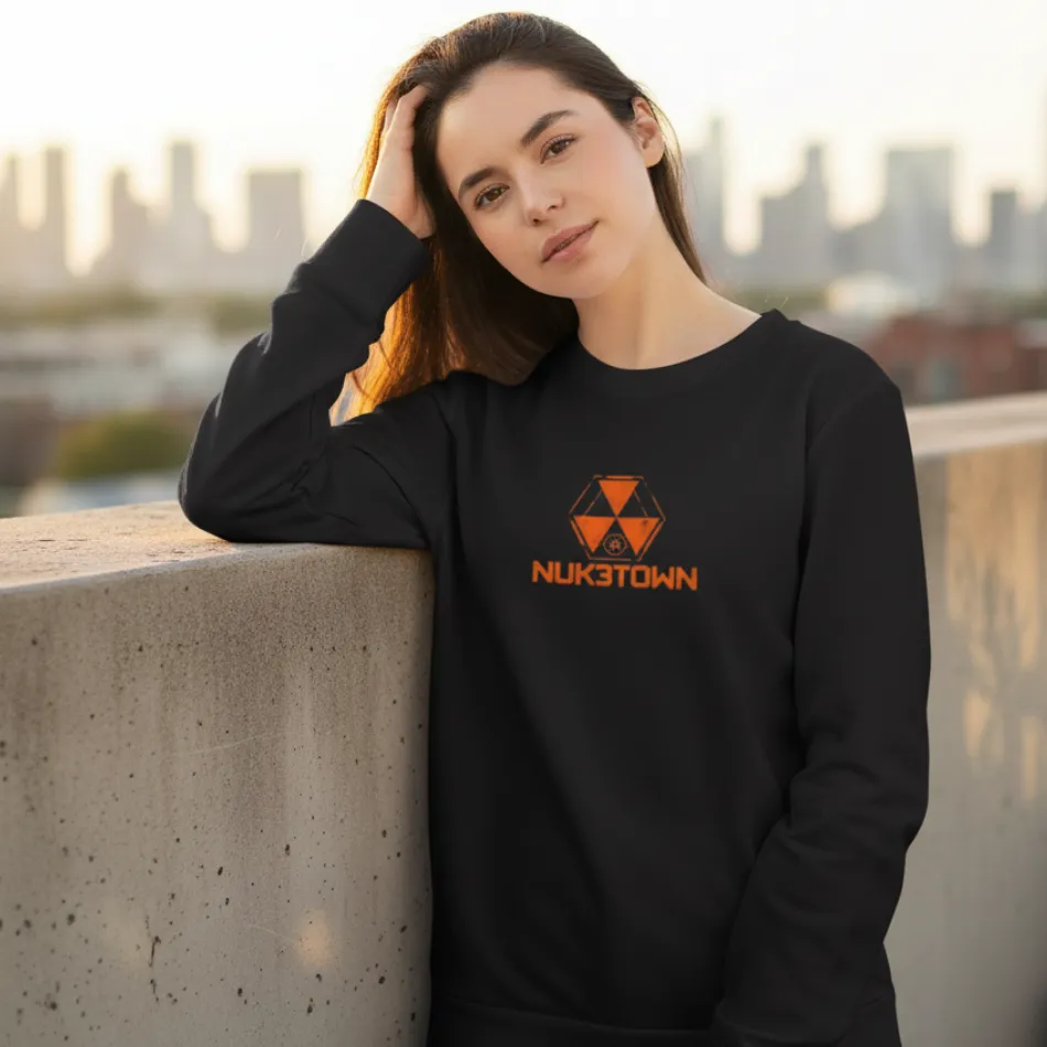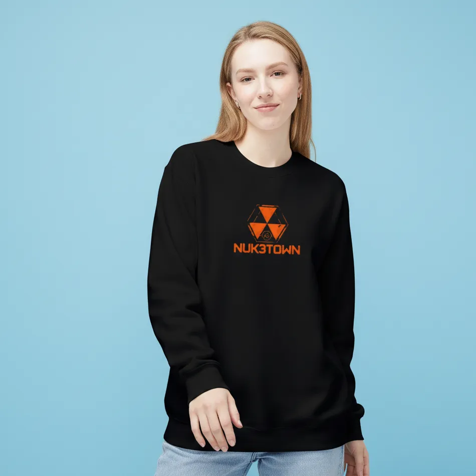 PUBG inspired black sweatshirt for women featuring a Nuke Town text-and-logo graphic inspired by iconic battle royale maps, blending gaming culture with modern streetwear comfort.