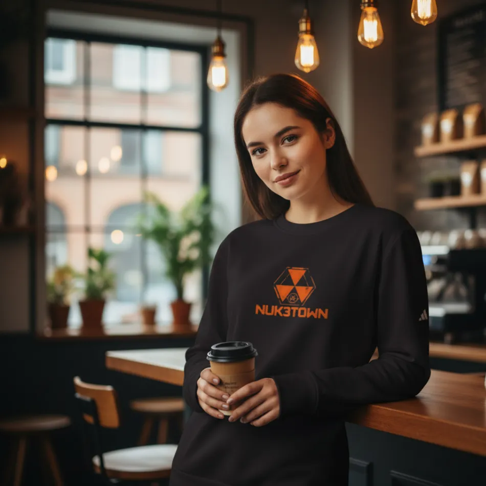 A PUBG inspired black sweatshirt for women featuring a bold Nuke Town text-and-logo graphic inspired by iconic battle royale maps. Soft, breathable, and easy to layer, it’s perfect for everyday wear across winter, autumn, and mild rainy seasons.