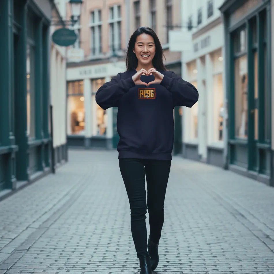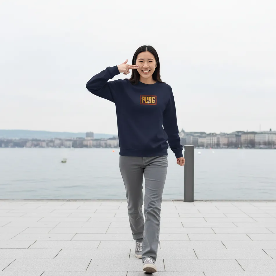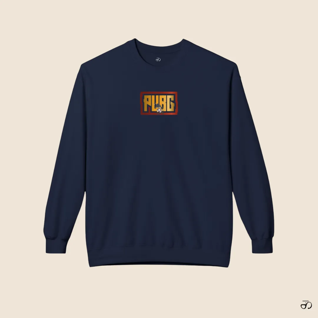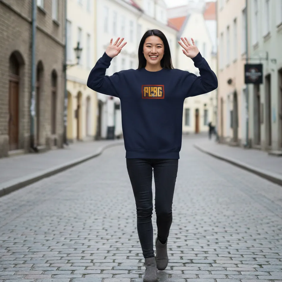 PUBG inspired navy sweatshirt for women crafted with a bold gaming text graphic inspired by the popular PUBG game.