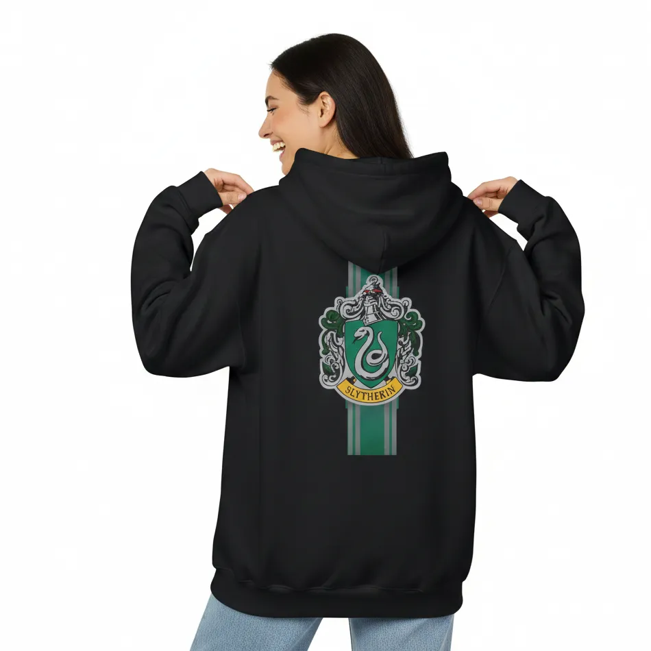 A Slytherin inspired black hoodie for women featuring a Harry Potter-themed graphic. Soft, breathable, and easy to layer, this hoodie is perfect for everyday wear across winter, autumn, and mild rainy seasons.