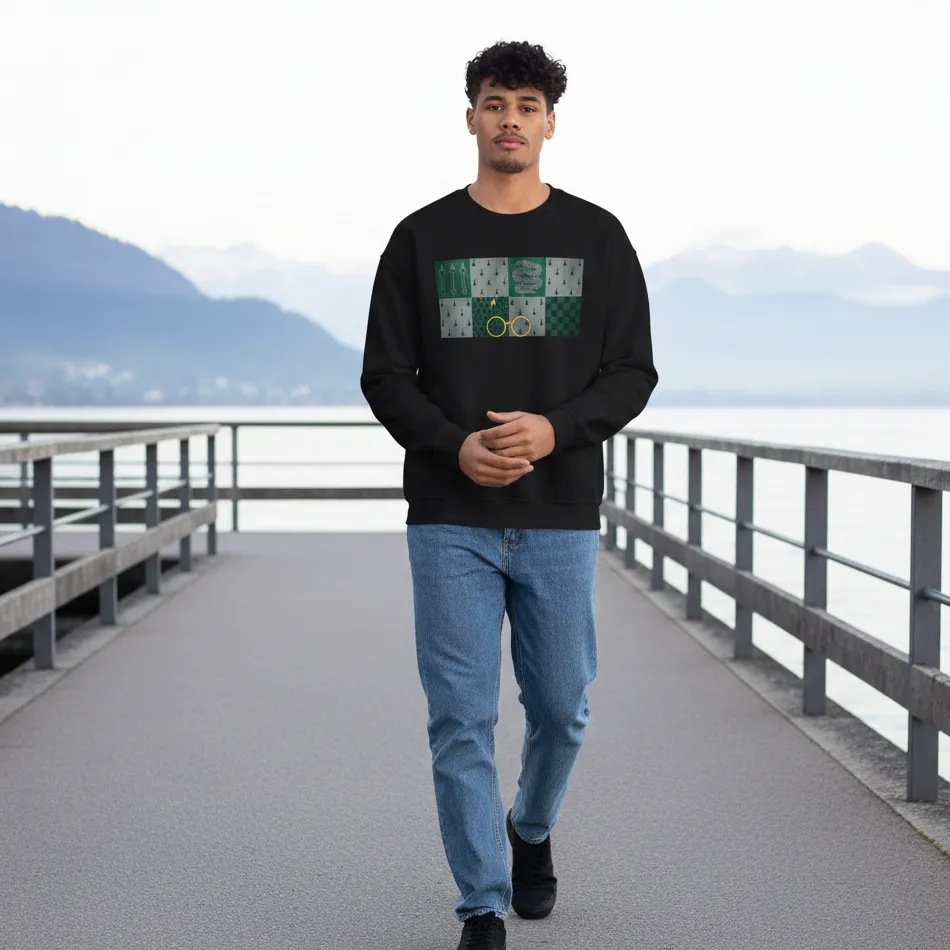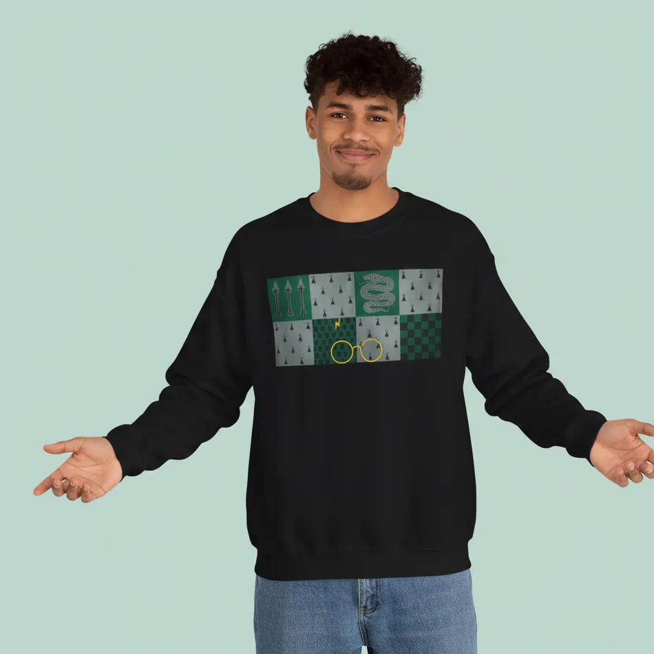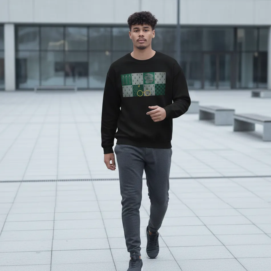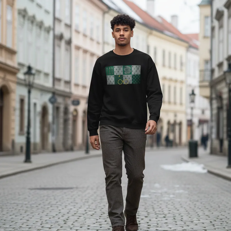 Slytherin inspired black sweatshirt for men designed with a bold slitherin serpent graphic inspired by a legendary wizarding house known for ambition and strength.