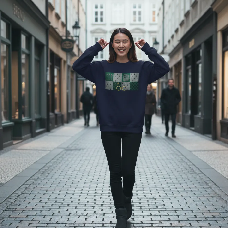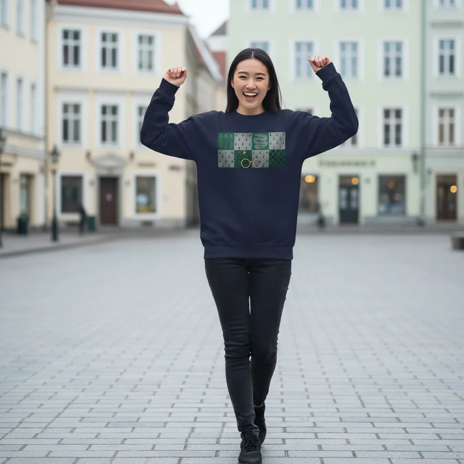 Slytherin inspired navy sweatshirt for women designed with a bold graphic inspired by the Slytherin house from the Harry Potter series, combining magical charm with modern everyday comfort.