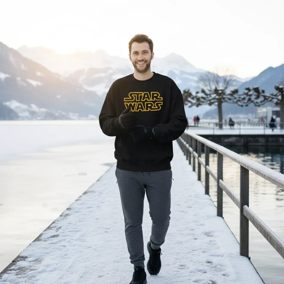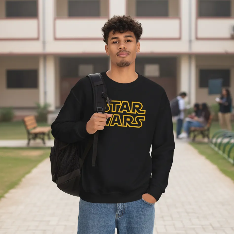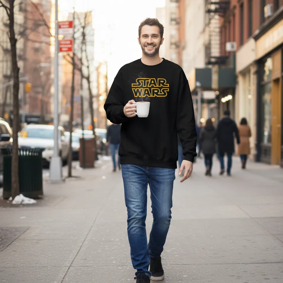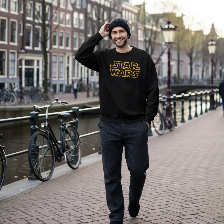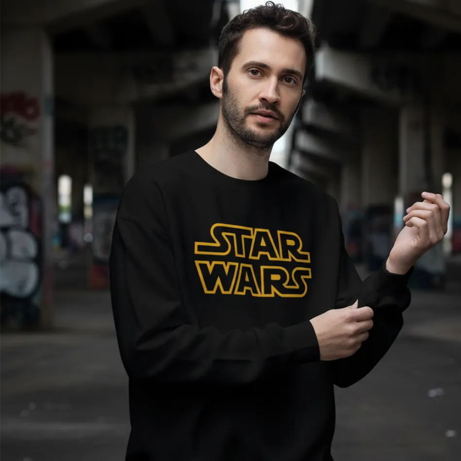 Star Wars inspired black sweatshirt for men designed with a bold text graphic inspired by the legendary Star Wars universe, blending iconic sci-fi aesthetics with modern casual comfort.