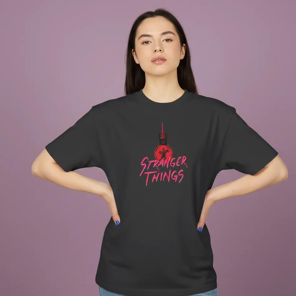Inspired by the thrilling world of Stranger Things, this Stranger Things inspired black oversized t-shirt captures the bold, retro, and mysterious vibe of the series. Designed exclusively for women, it combines comfort, confidence, and fandom expression in one powerful streetwear piece.