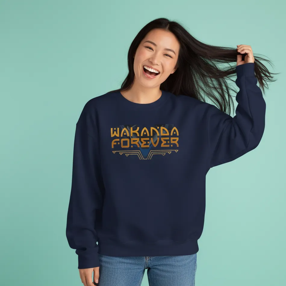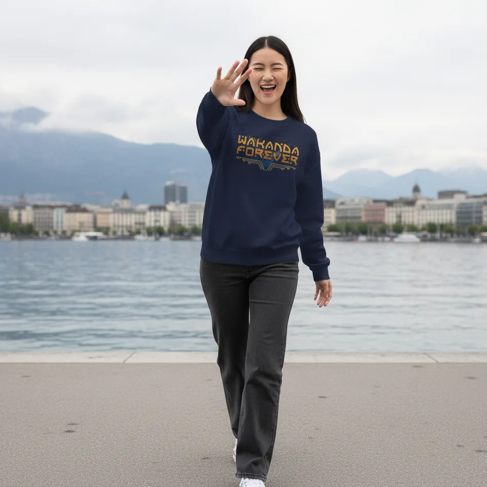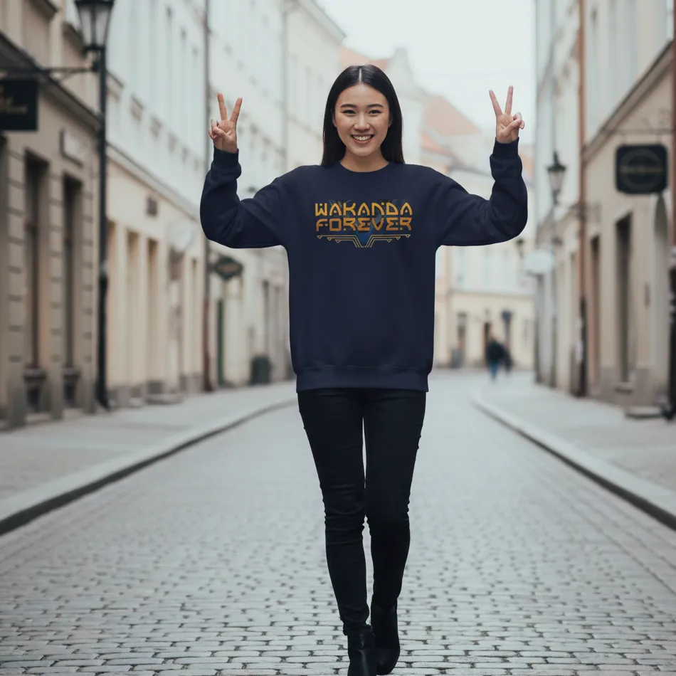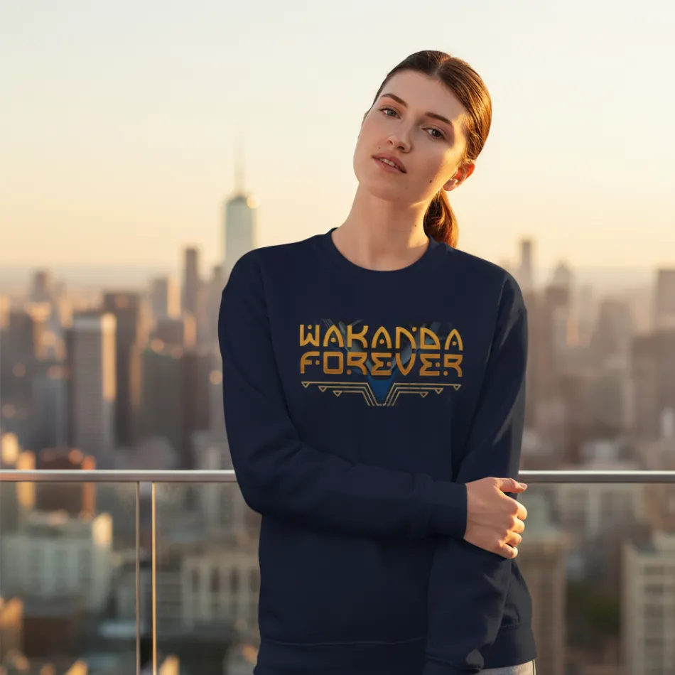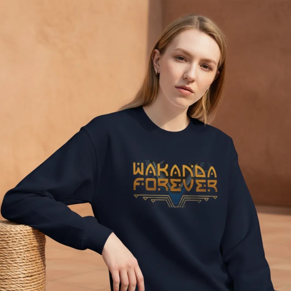 Wakanda Forever inspired navy sweatshirt for women designed with a bold text graphic celebrating the iconic Black Panther residence, blending Marvel Universe energy with modern everyday comfort.