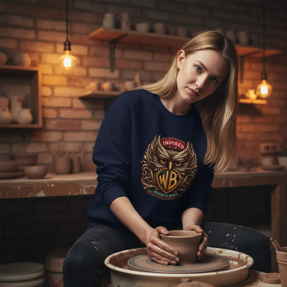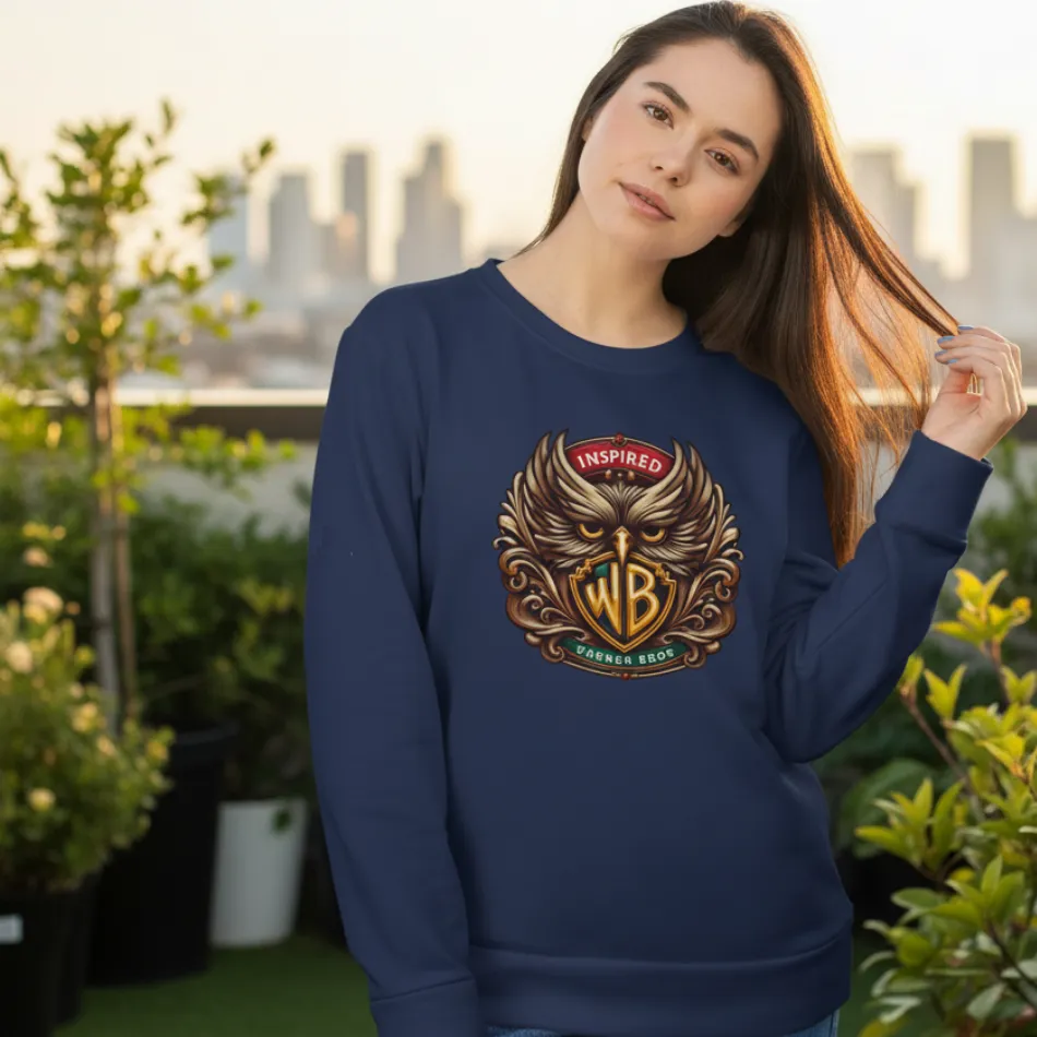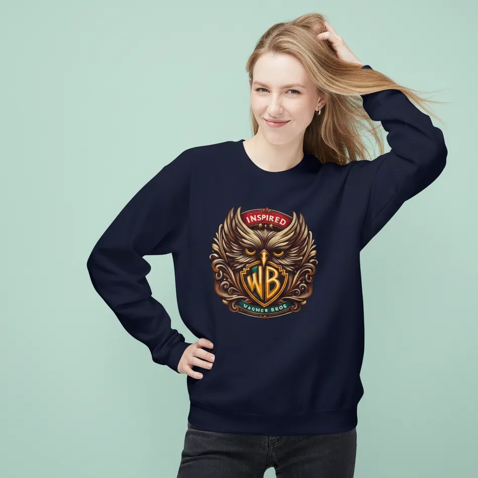 Warner bros inspired navy sweatshirt for women designed with a creative owl logo graphic inspired by an iconic studio emblem.